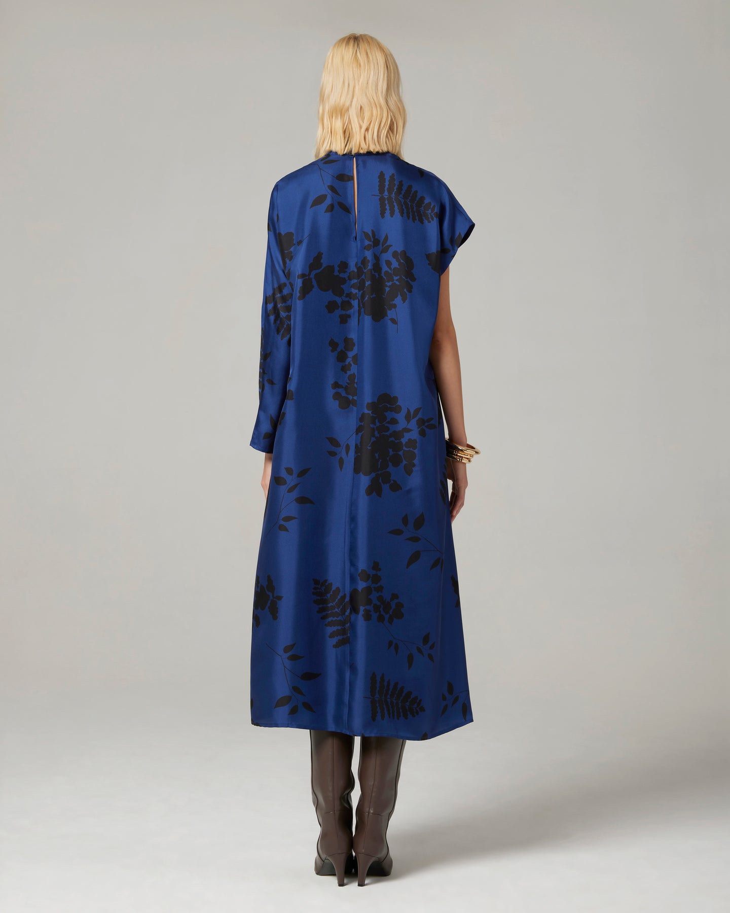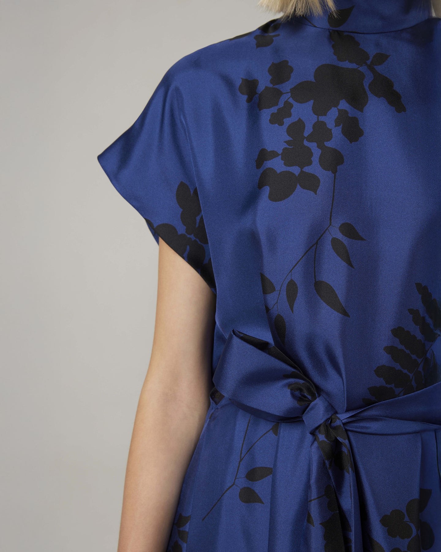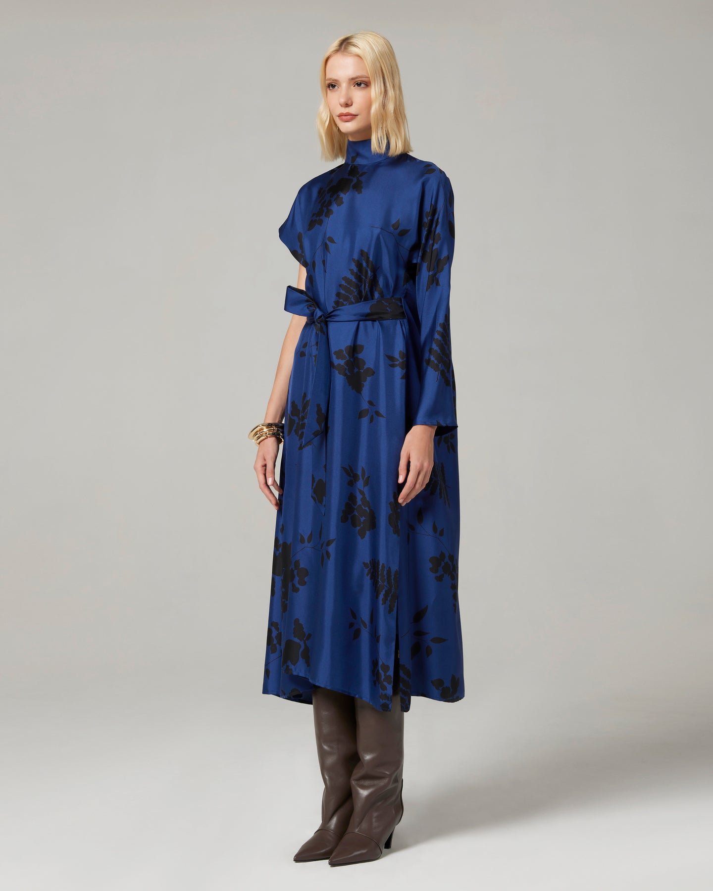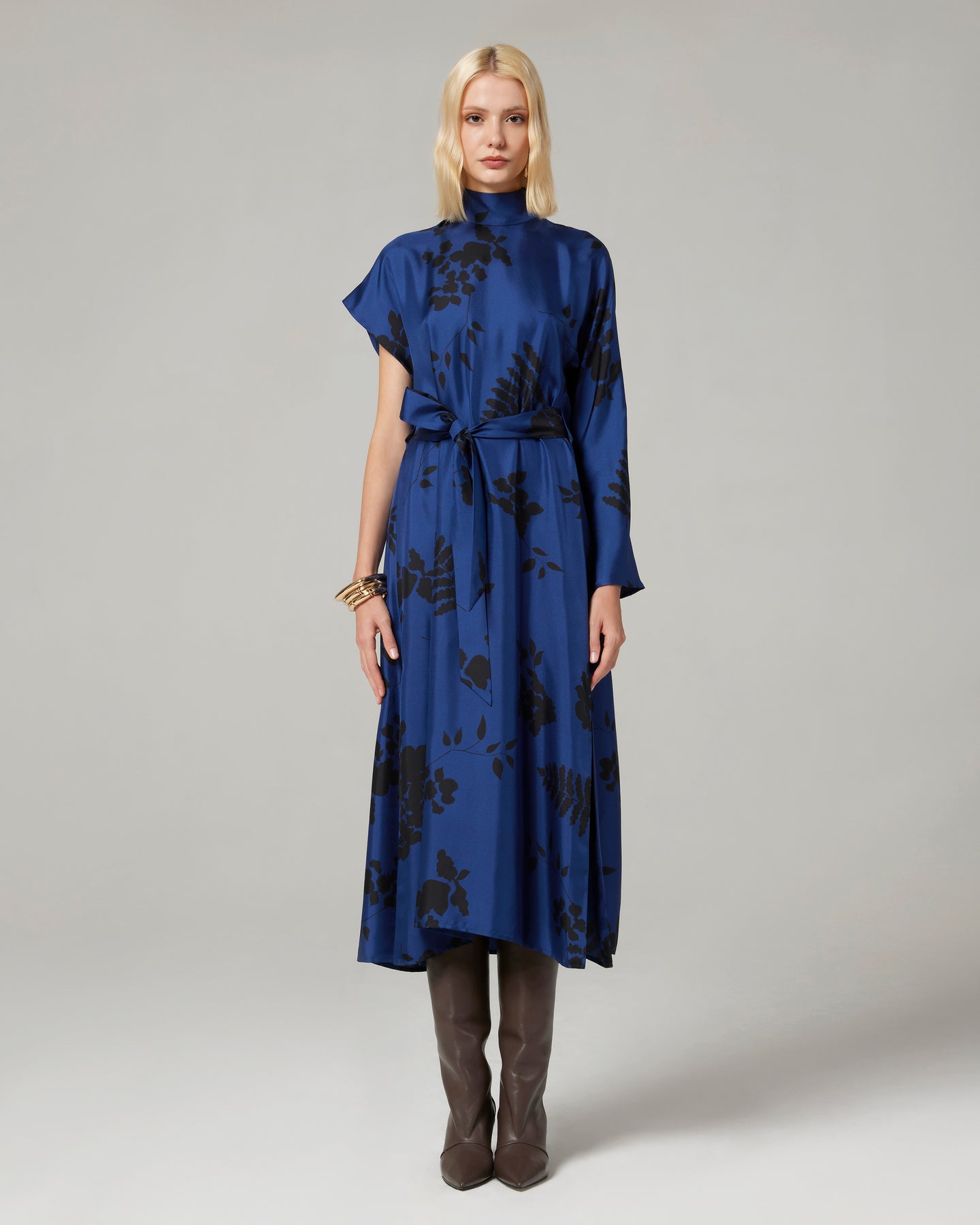 Abito con maniche asimmetriche in twill di seta stampato in una delicata fantasia stilizzata. Dalla silhouette contemporanea, si raggruppa sul davanti con una cintura. Collo alto a listino, spacchi laterali.