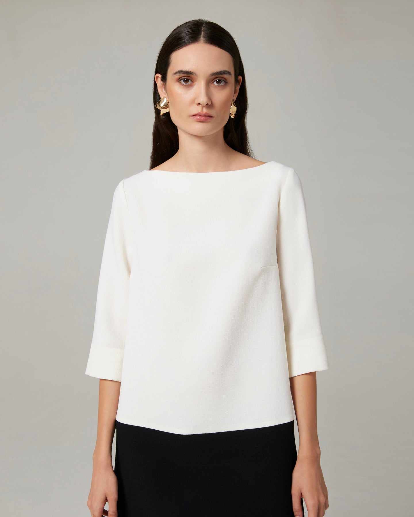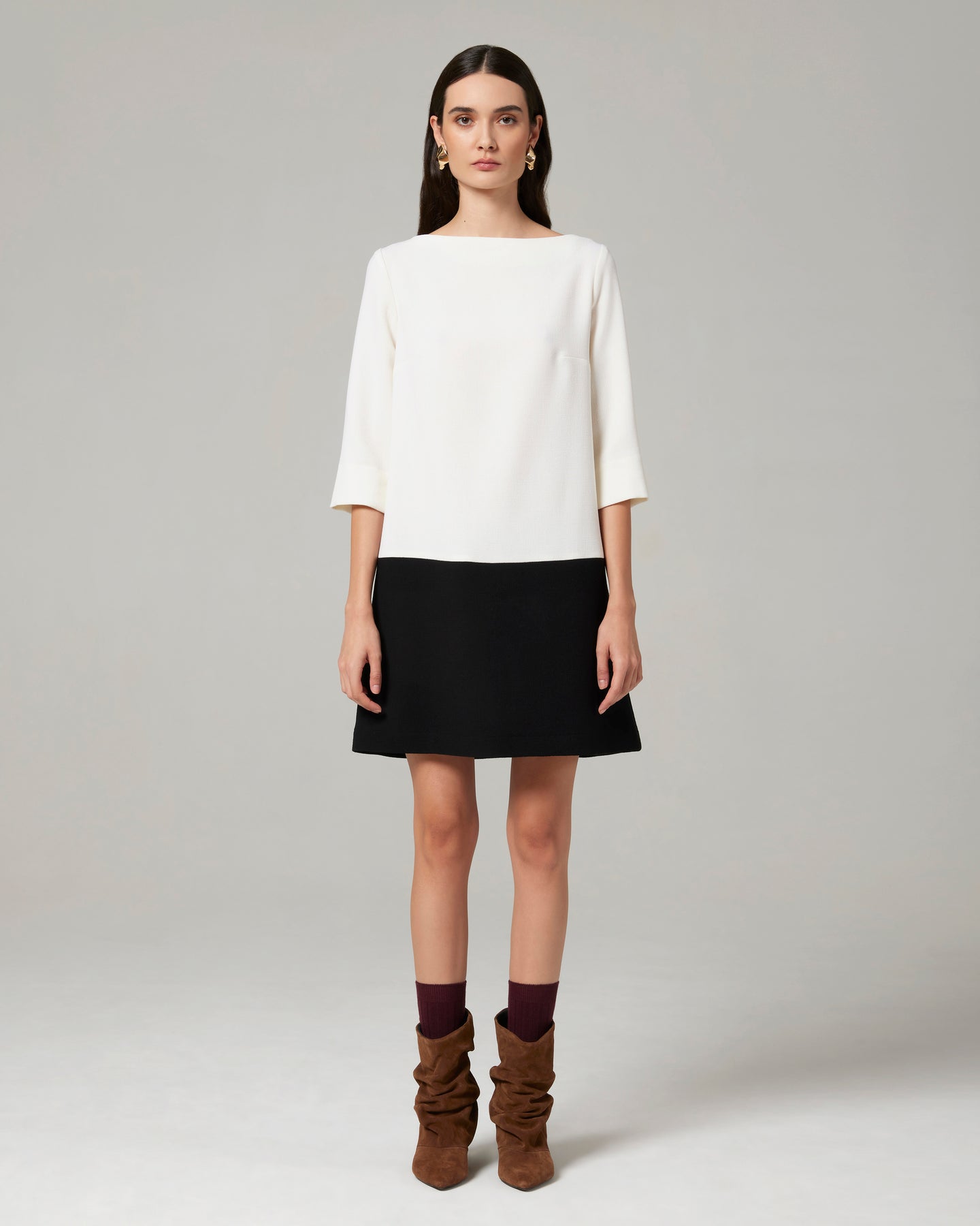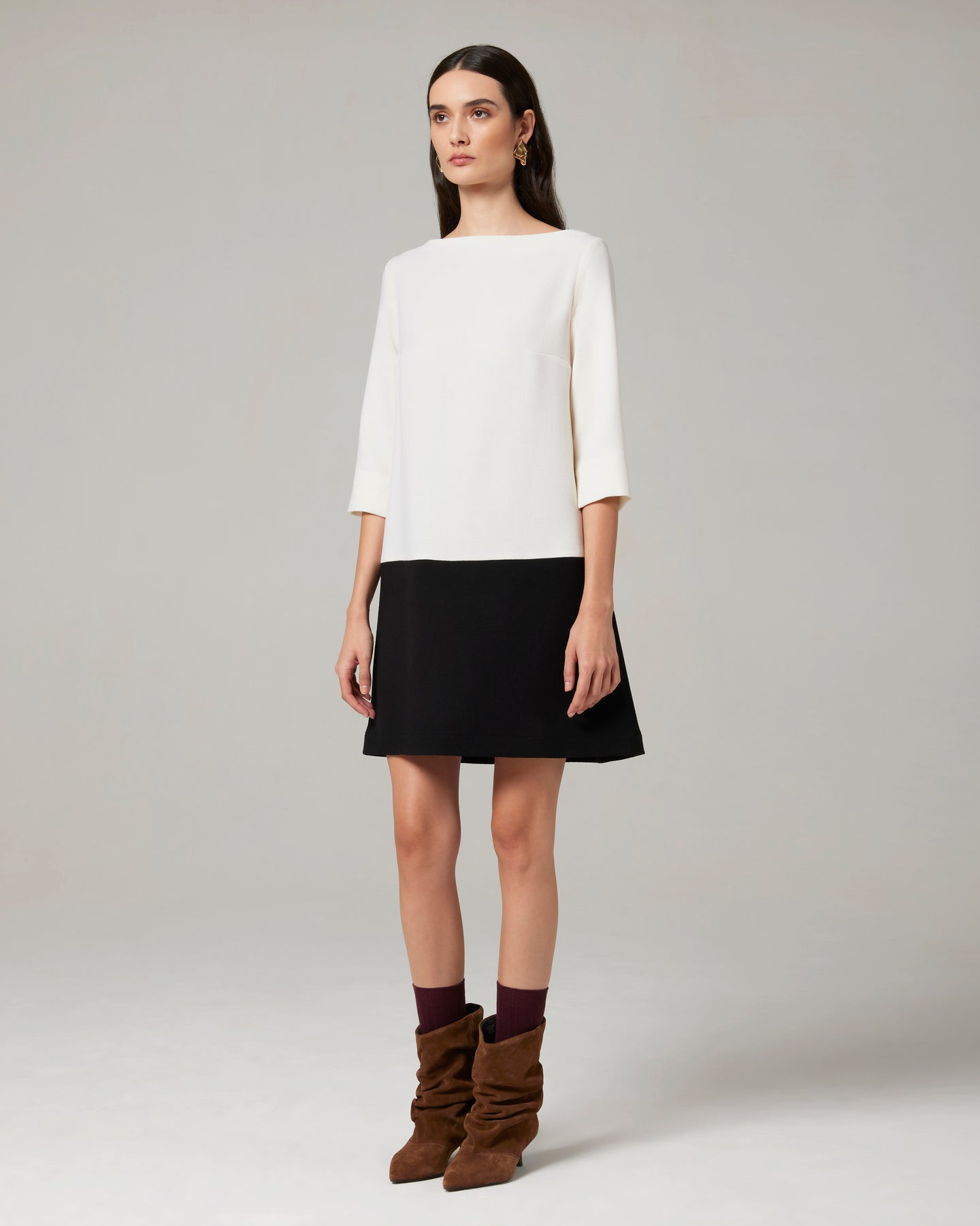 Abito a trapezio bicolore in doppio crepe di pura lana.