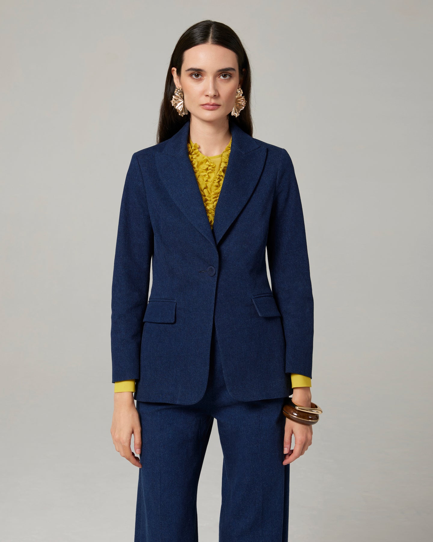 Giacca monopetto con ampio revere dalle proporzioni perfette. Accostata in vita, spacchi posteriori. Qui nella versione in denim.