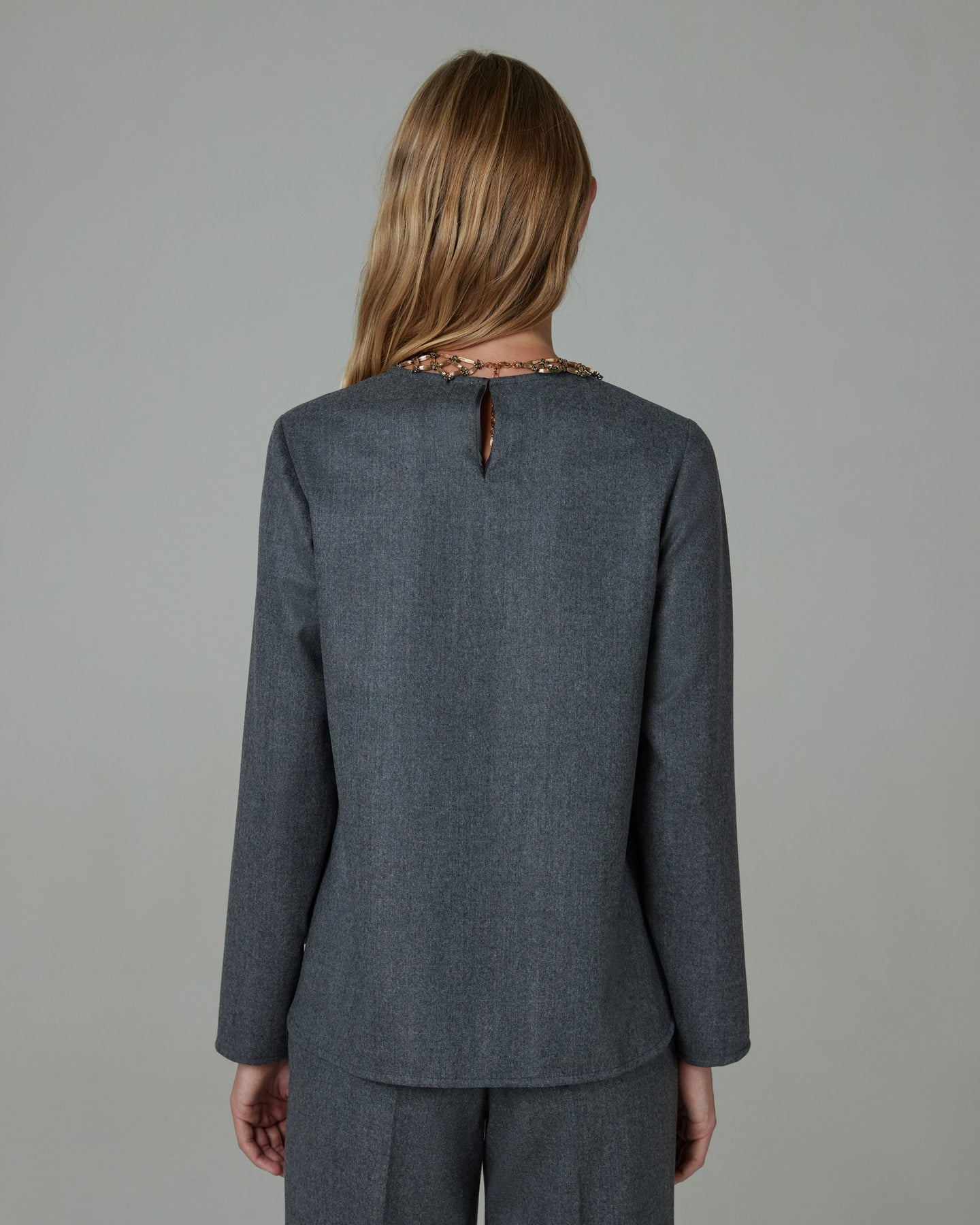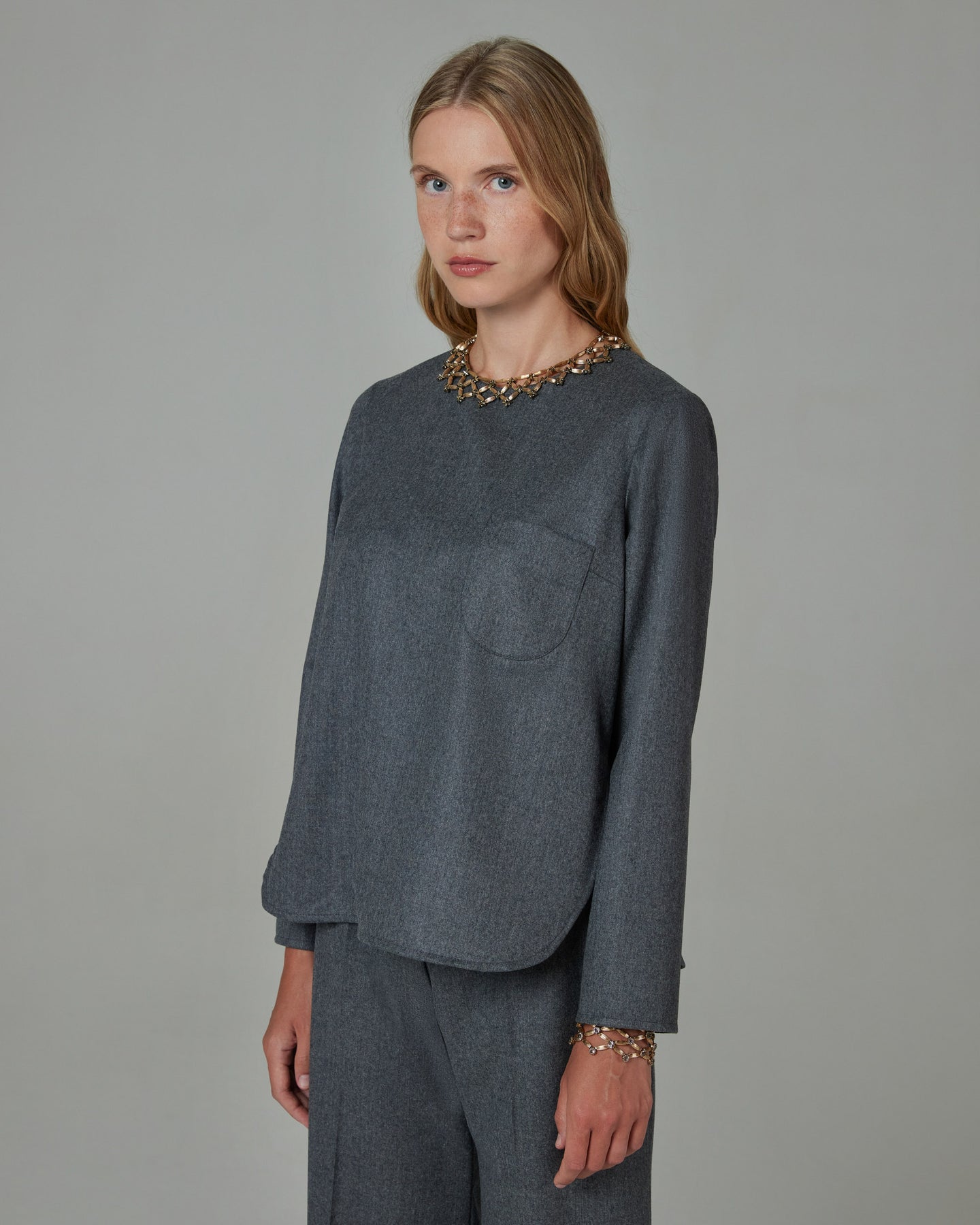 Blusa in flanella di pura lana: Forma a sacchetto, spacchi laterali, taschina applicata sul davanti.
