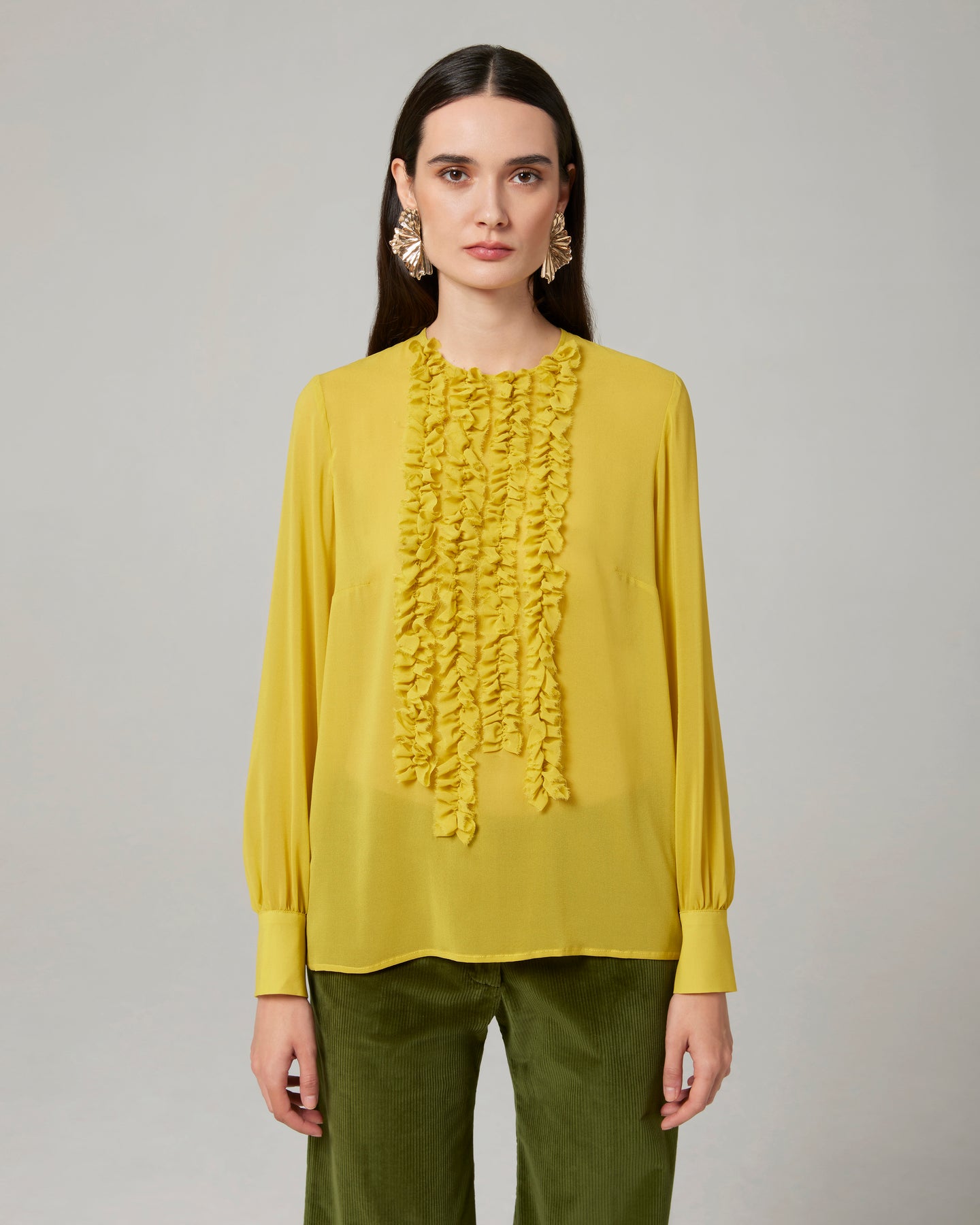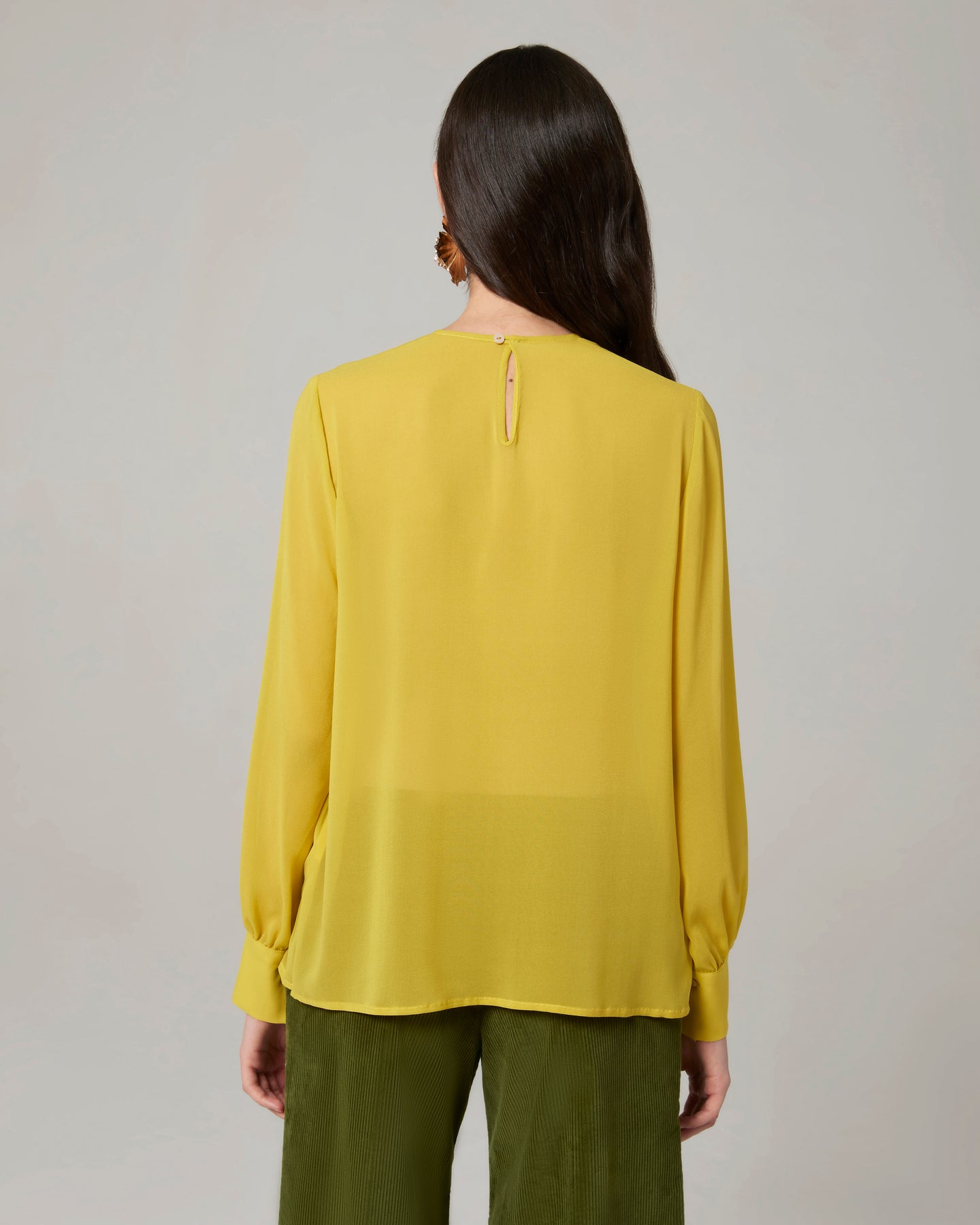 Blusa girocollo in georgette di pura seta con delicate rouches sul davanti.