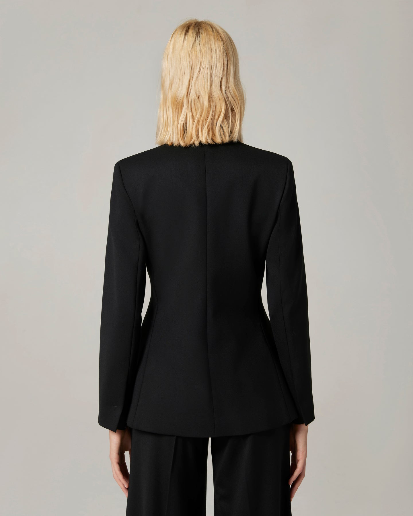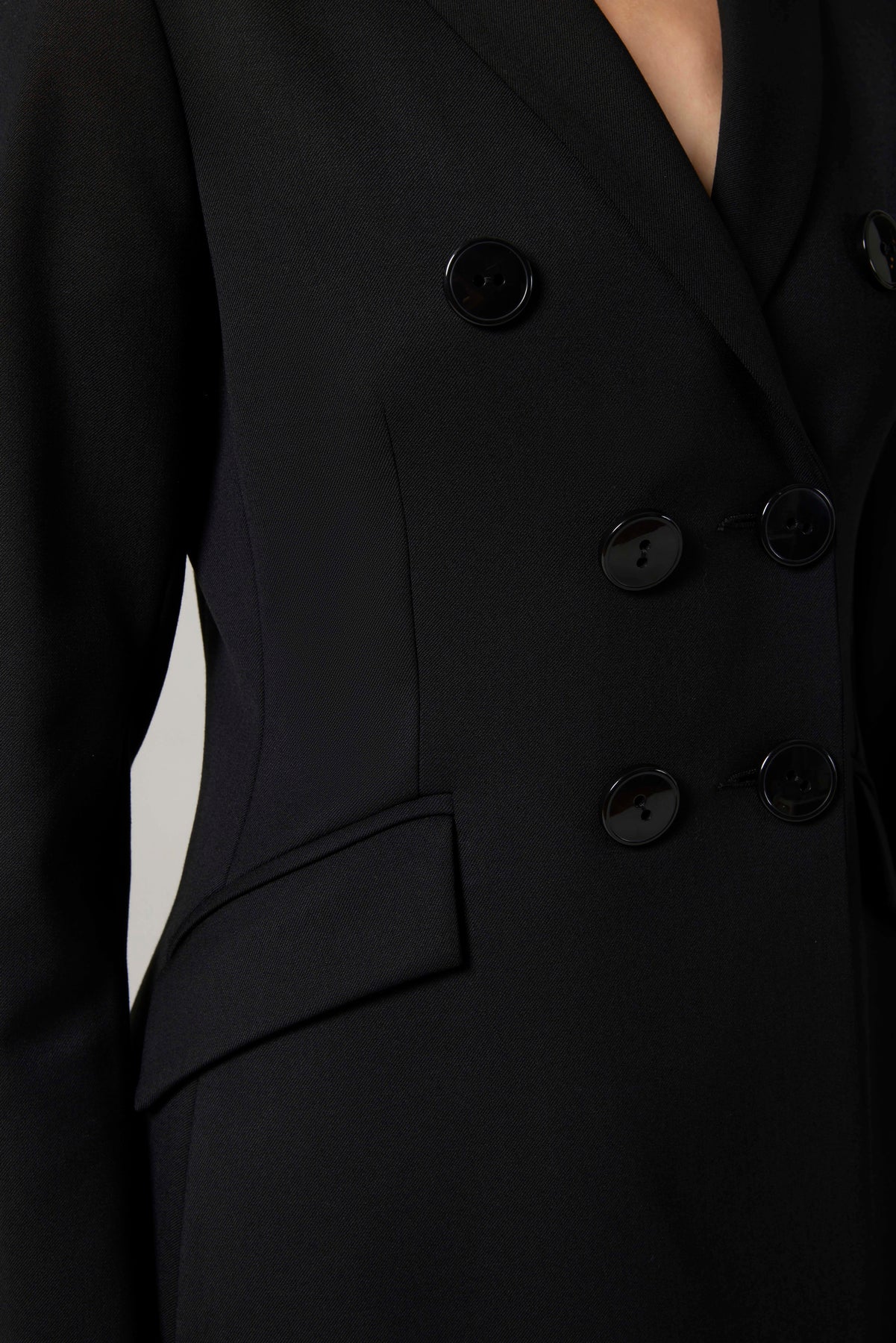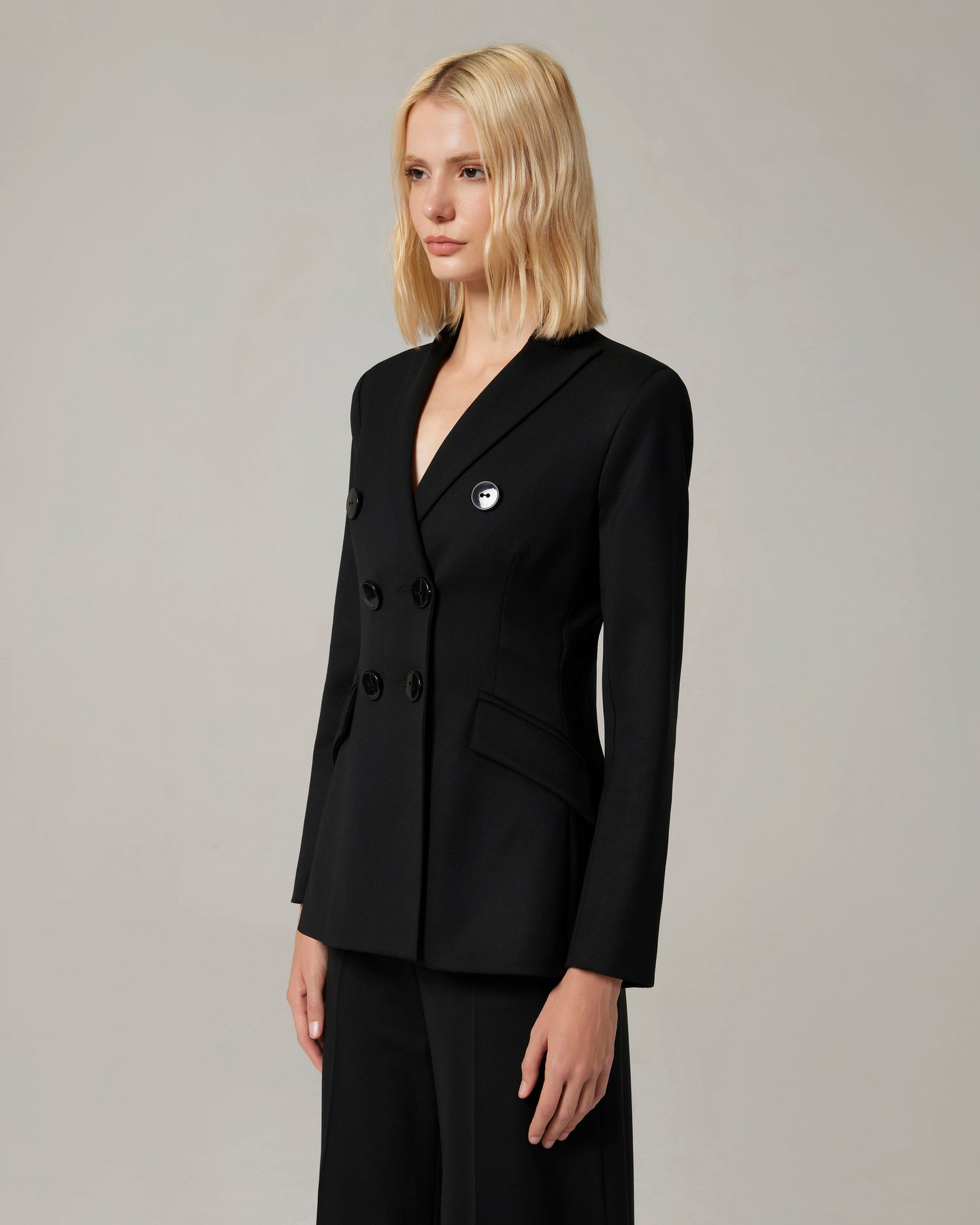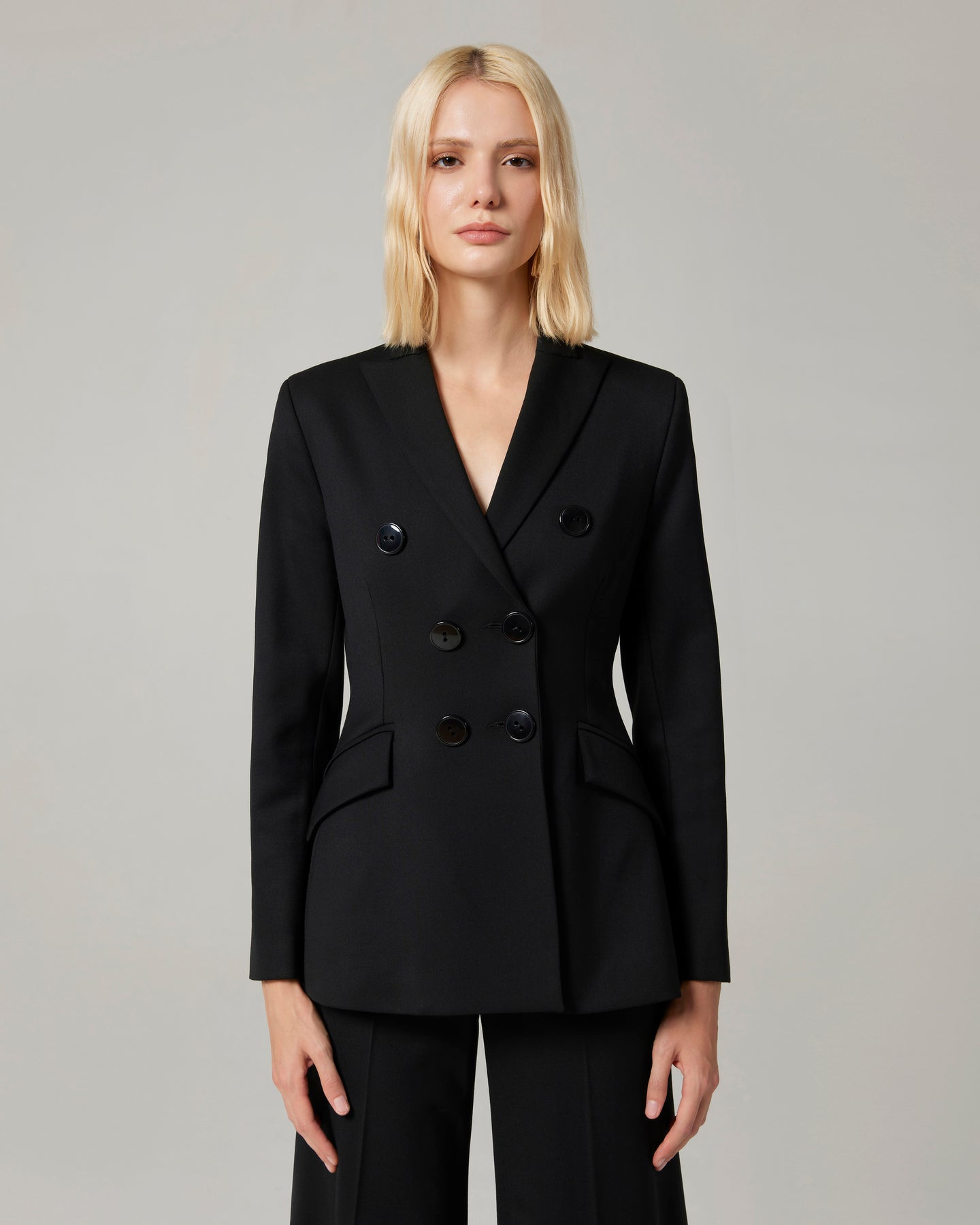 La giacca Ostuni è uno dei nostri bestseller. Doppiopetto in saglia di lana elasticizzata, vestibilità perfetta. Revere alto e a punta, sciancrato in vita, superfemminile. Veste bene tutte le taglie.