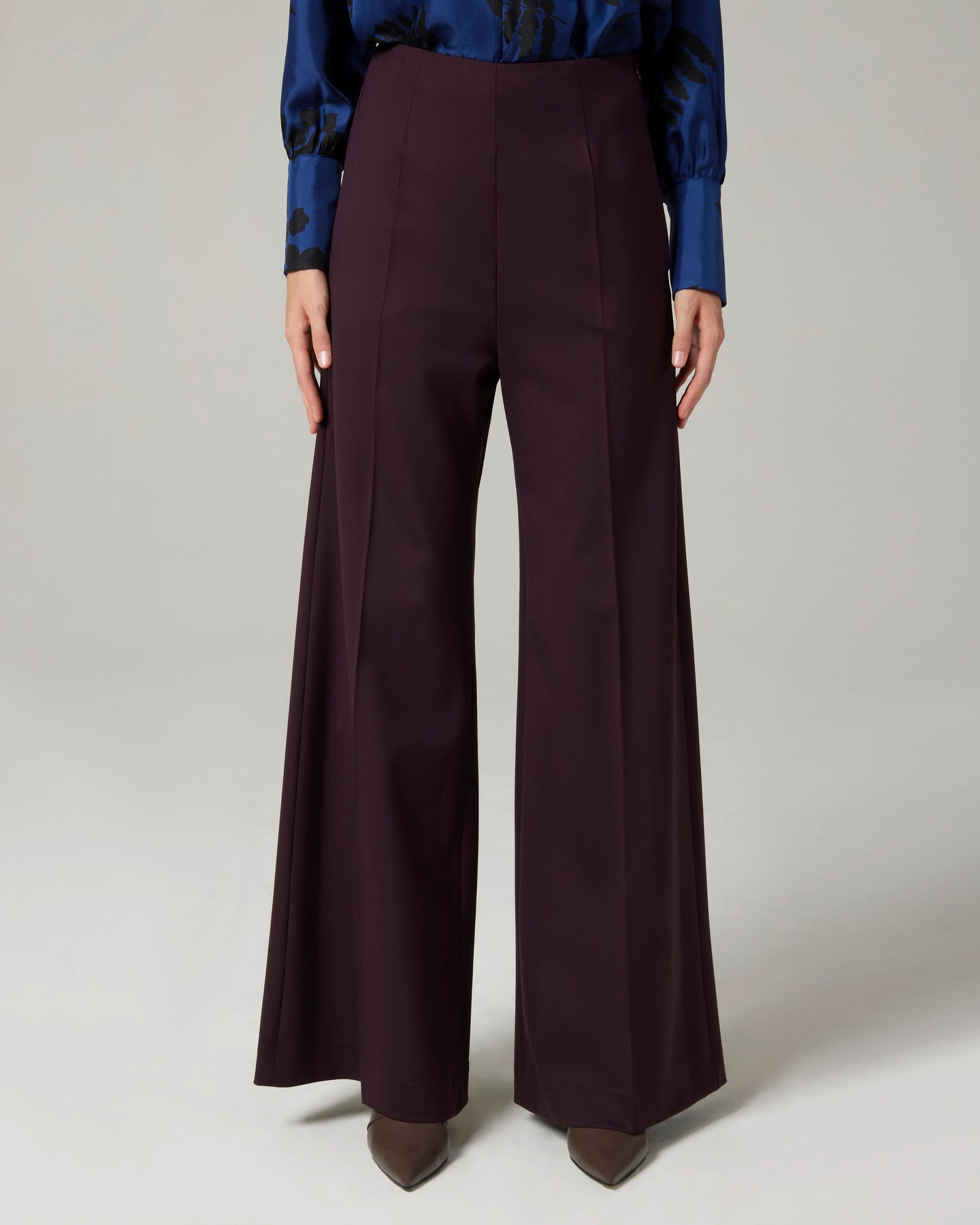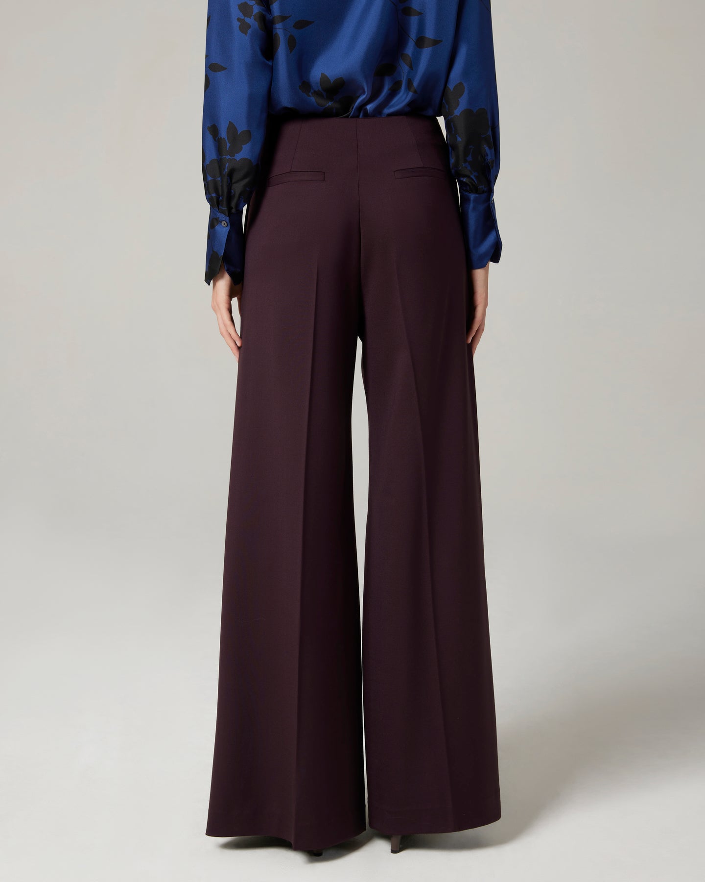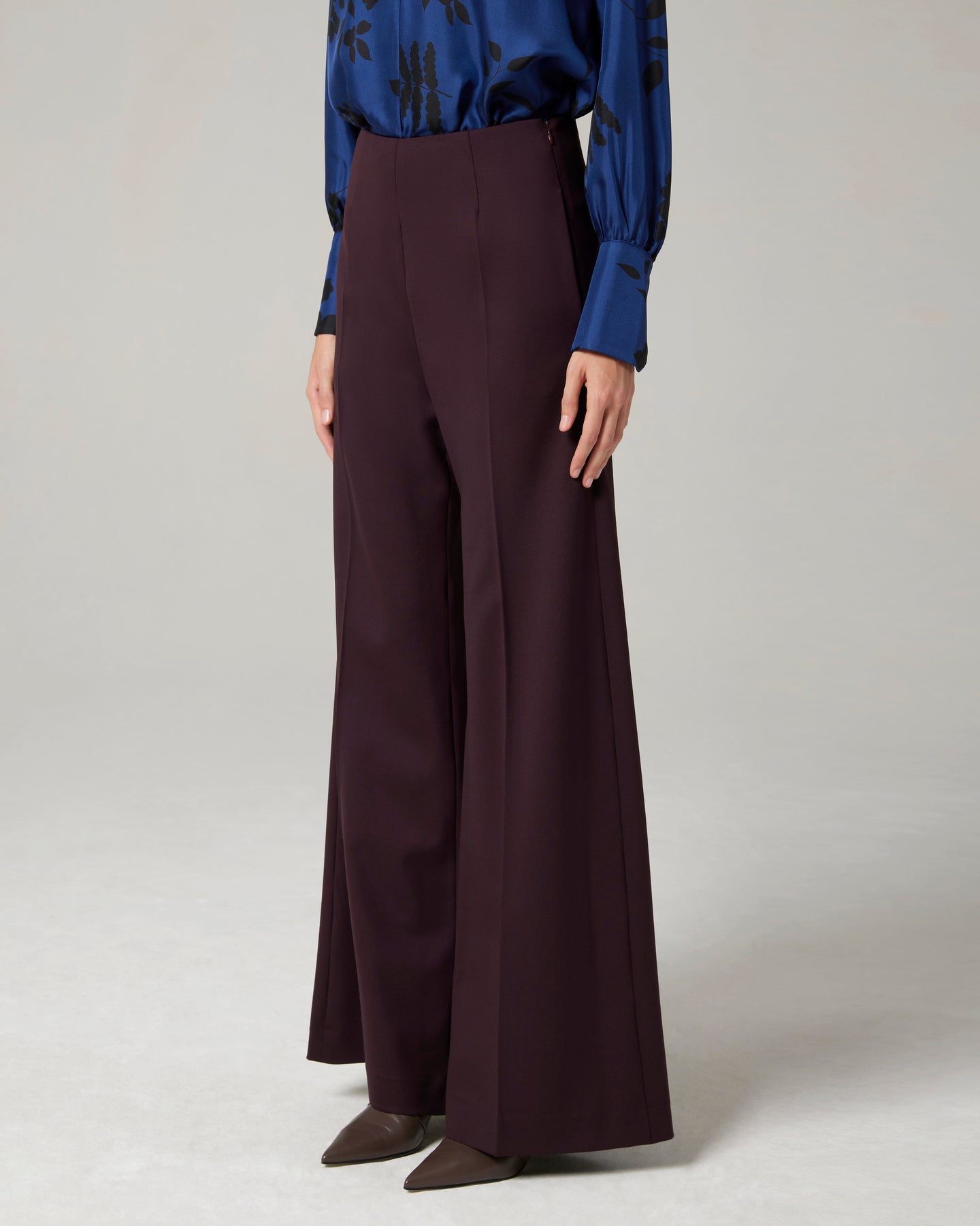 Pantalone a vita alta in saglia di lana elasticizzata dalla vestibilità perfetta, che slancia la figura. Cerniera laterale, tasche a filetto posteriori. Disponibile anche in nero.