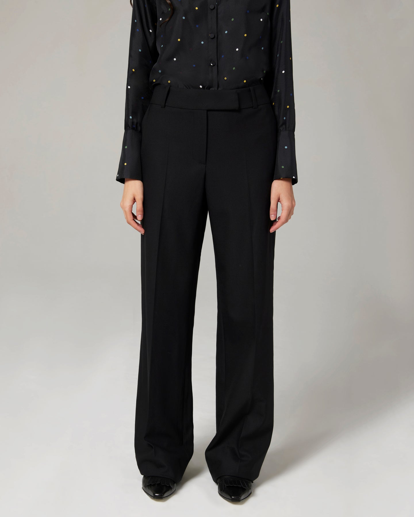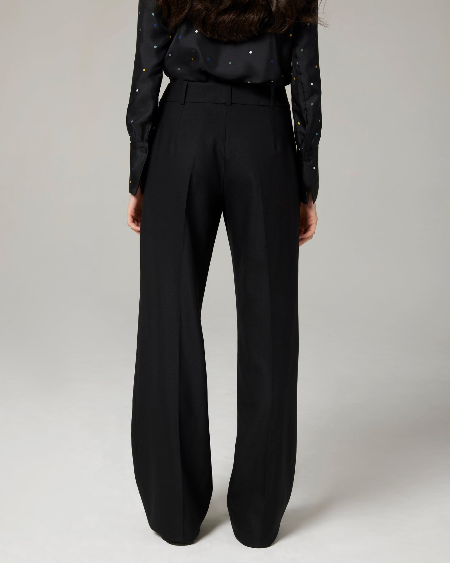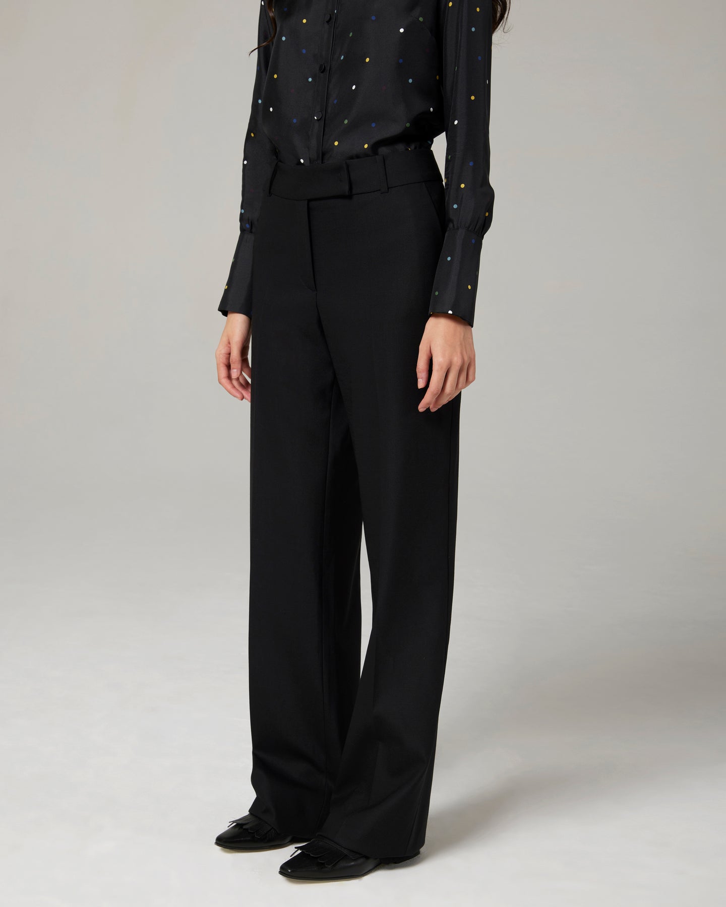 Pantalone di ispirazione maschile dalla linea dritta, con la vita appoggiata ai fianchi e alto cinturino. Veste bene tutte le taglie