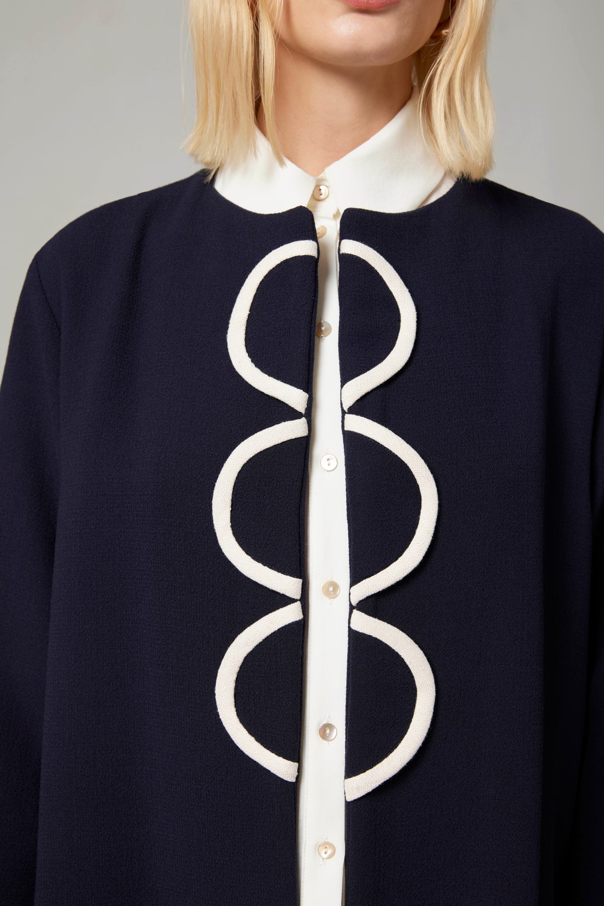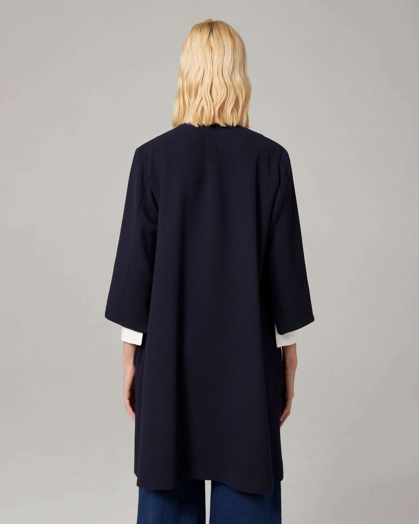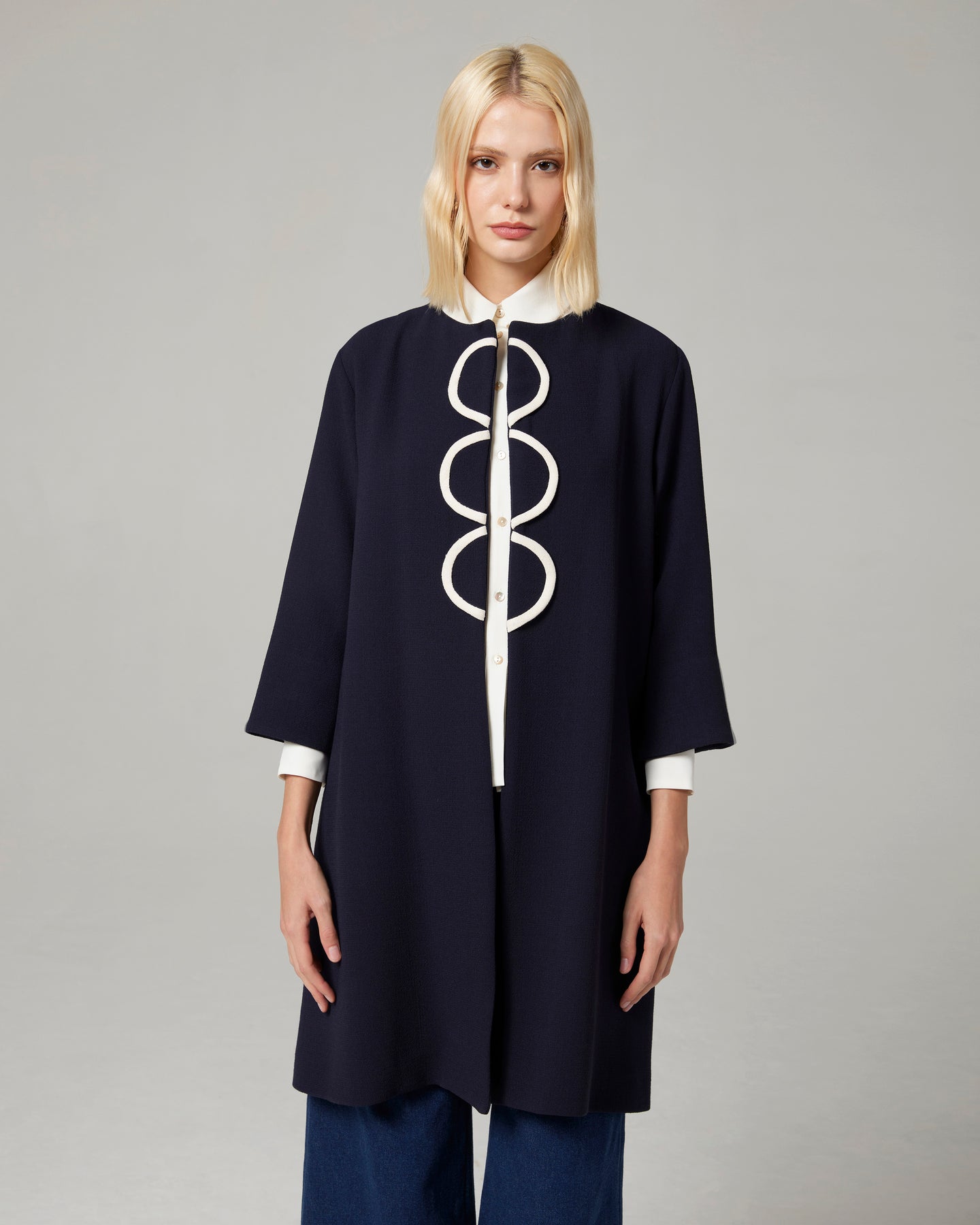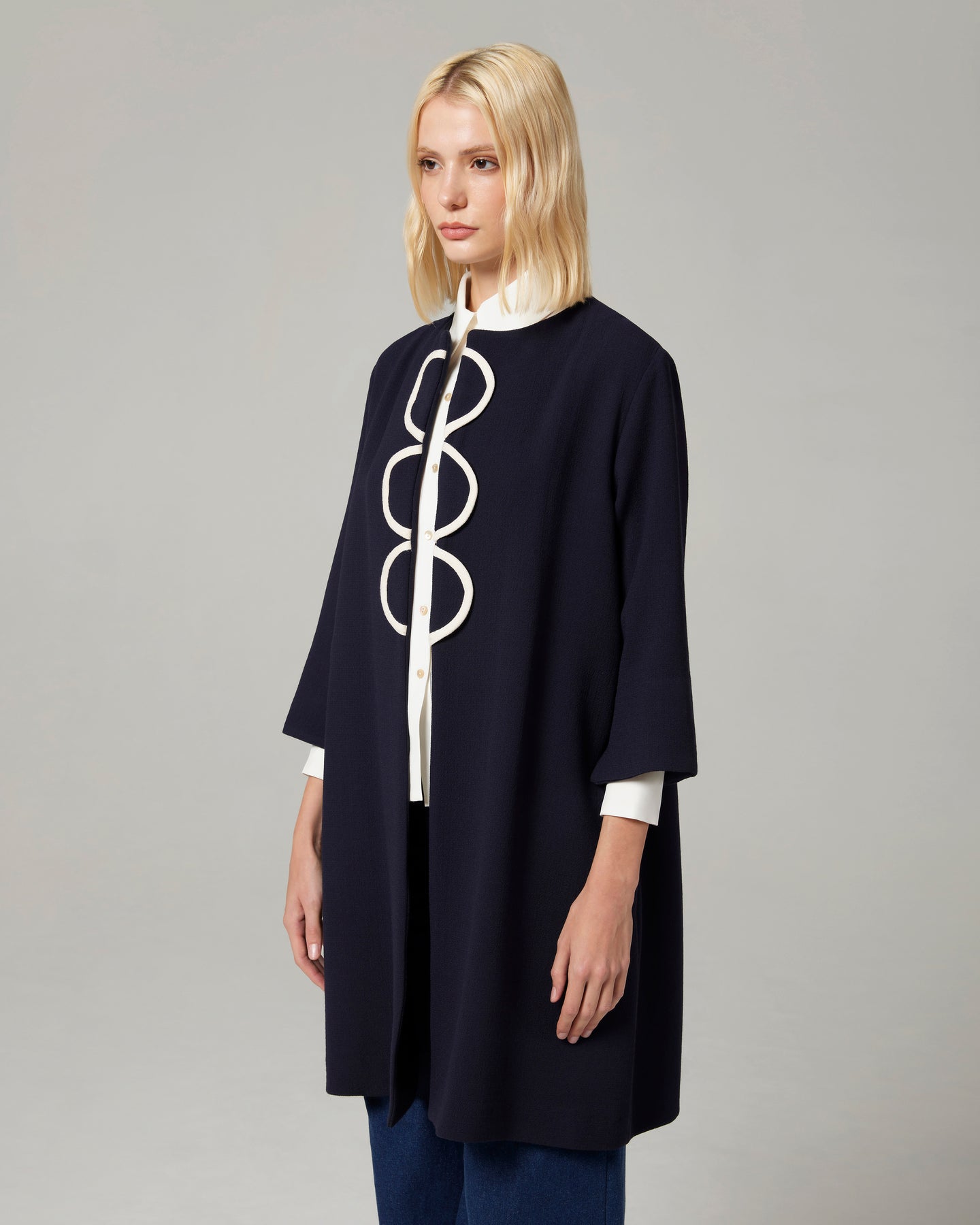 Spolverino in doppio crepe di pura lana con particolare dettaglio grafico a contrasto sul davanti. Sfoderato, maniche ¾.