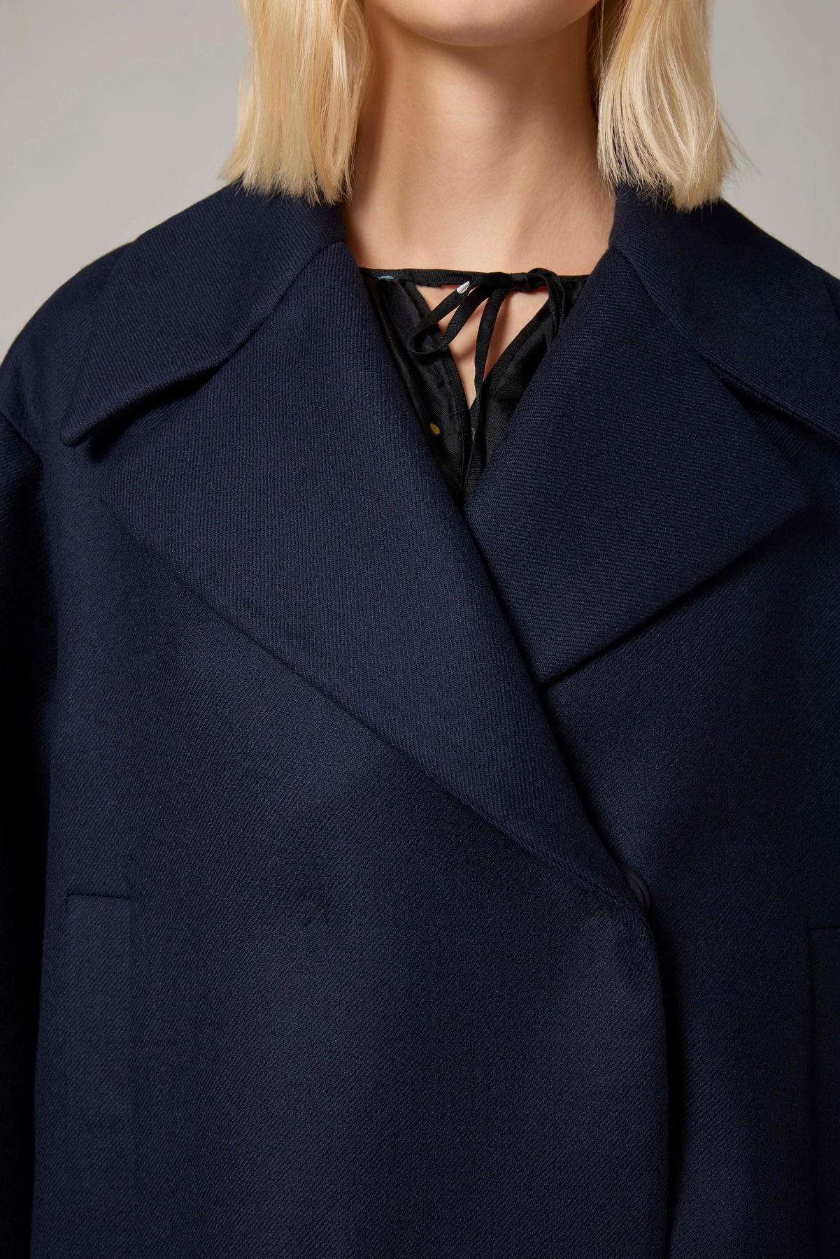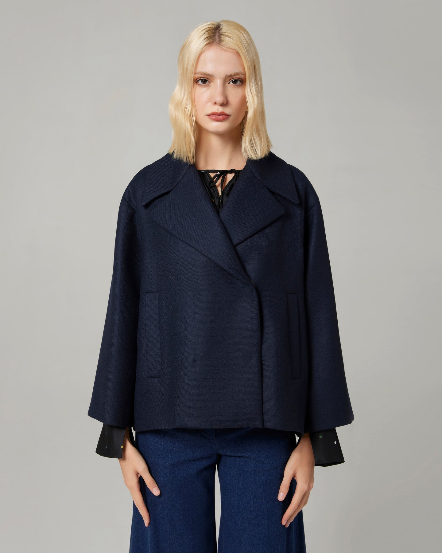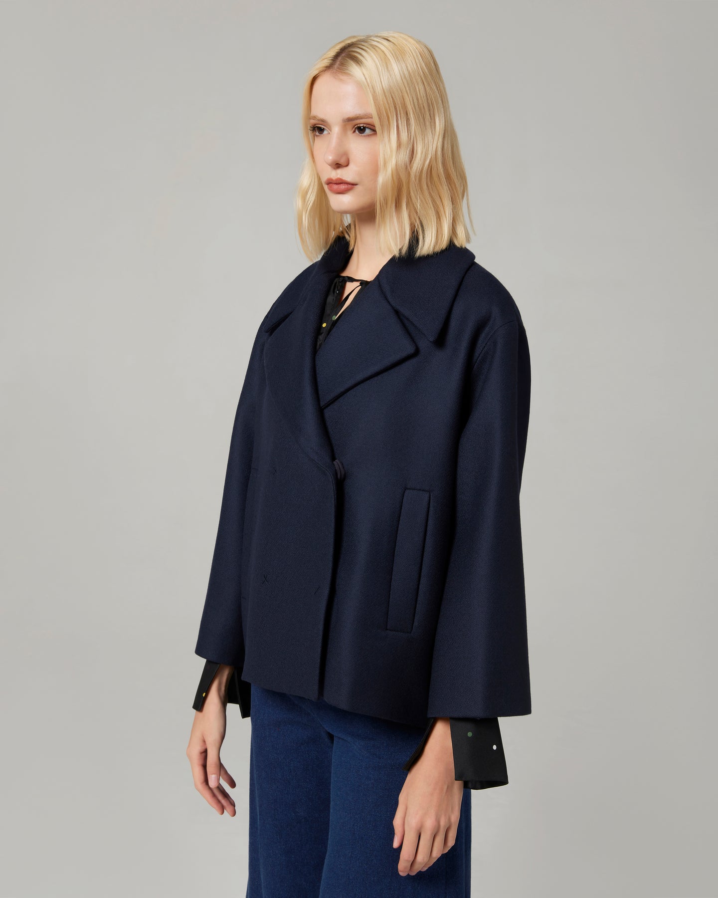 Caban doppiopetto, con ampio revere e lunghezza che arriva ai fianchi. In calda doppia flanella di pura lana è chiuso con automatici ricoperti.