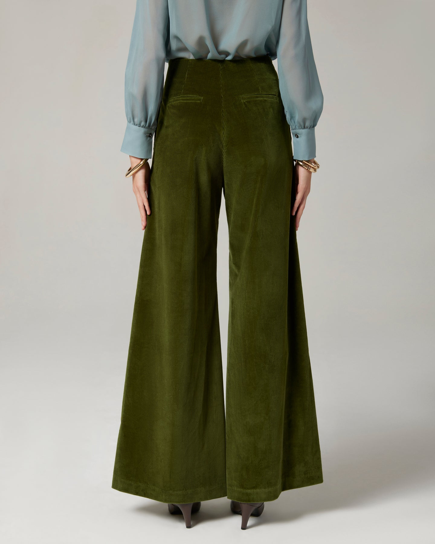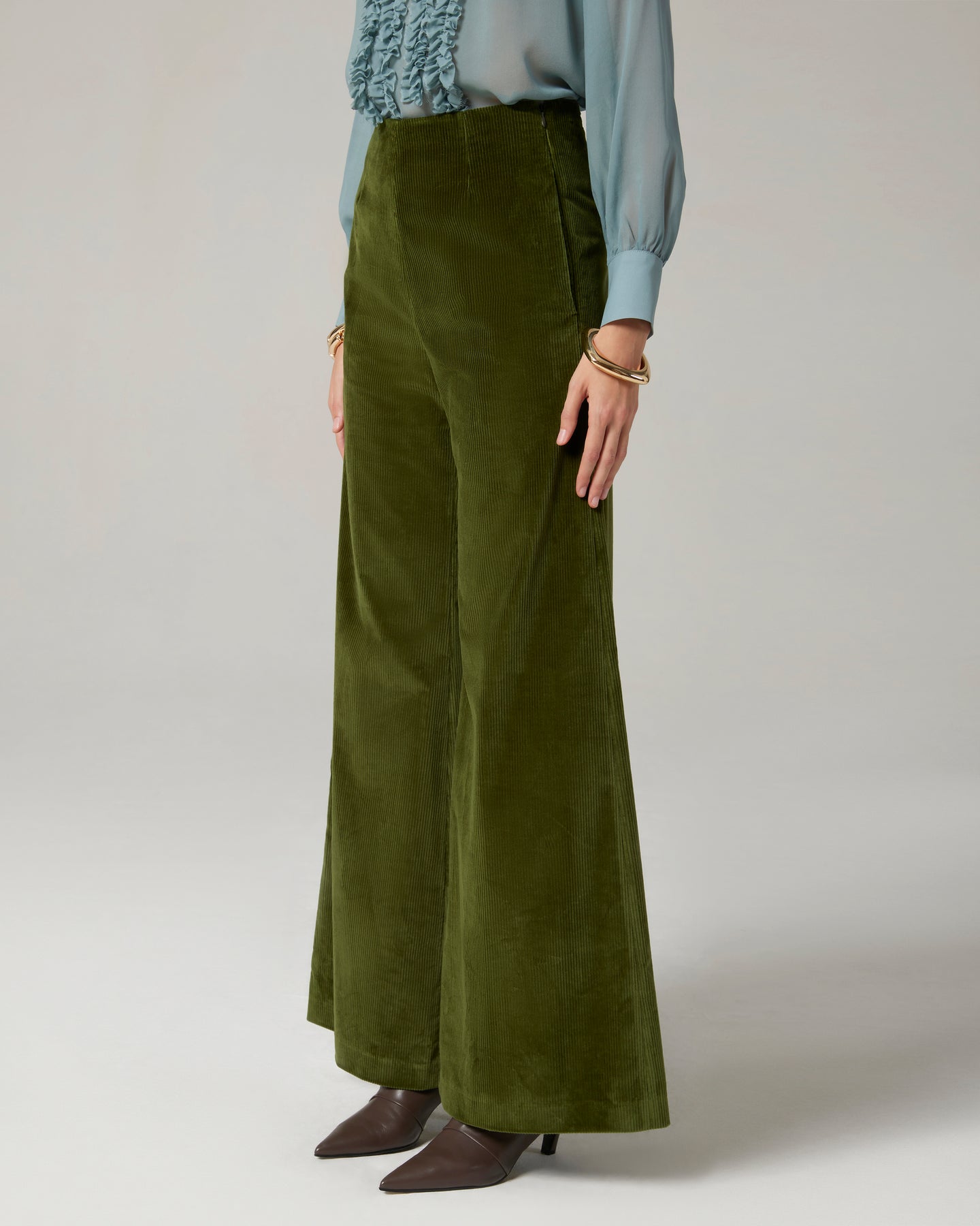 Pantalone a vita alta in velluto a coste dalla vestibilità perfetta, che slancia la figura. Cerniera laterale, tasche a filetto posteriori.