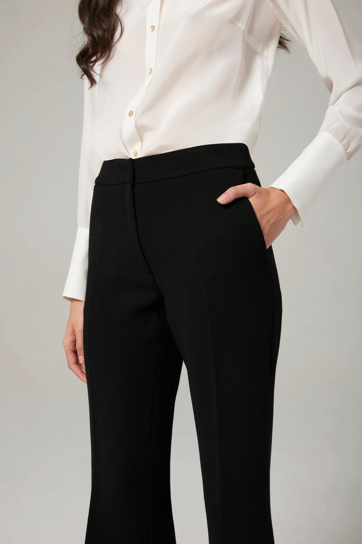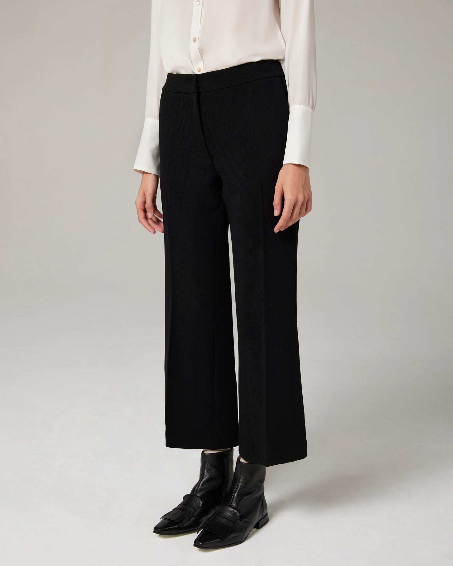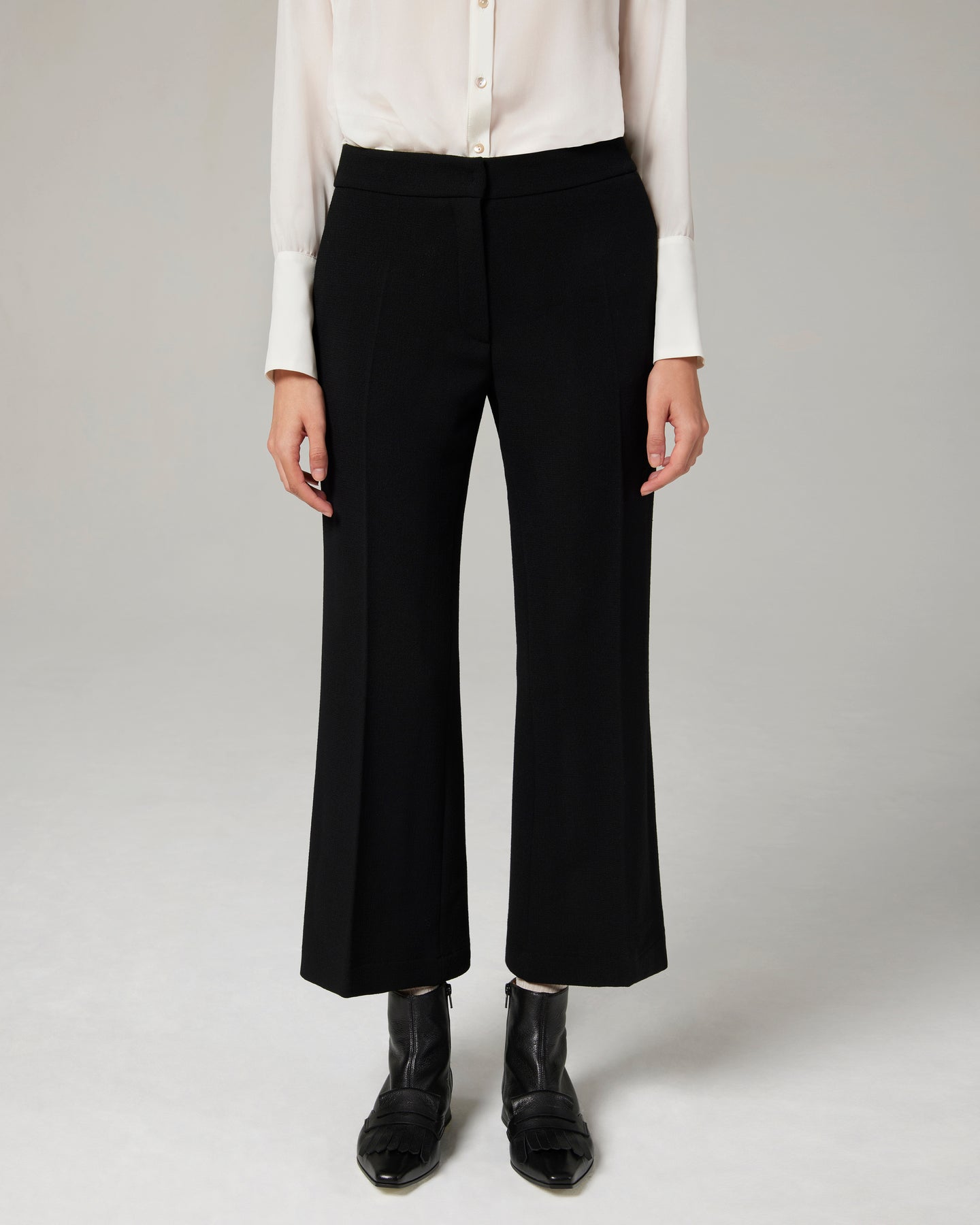 Un grande classico di 4uattro il pantalone a "trombetta" che slancia la figura. Qui in doppio crepe di pura lana, dalla lunghezza appena sopra la caviglia.