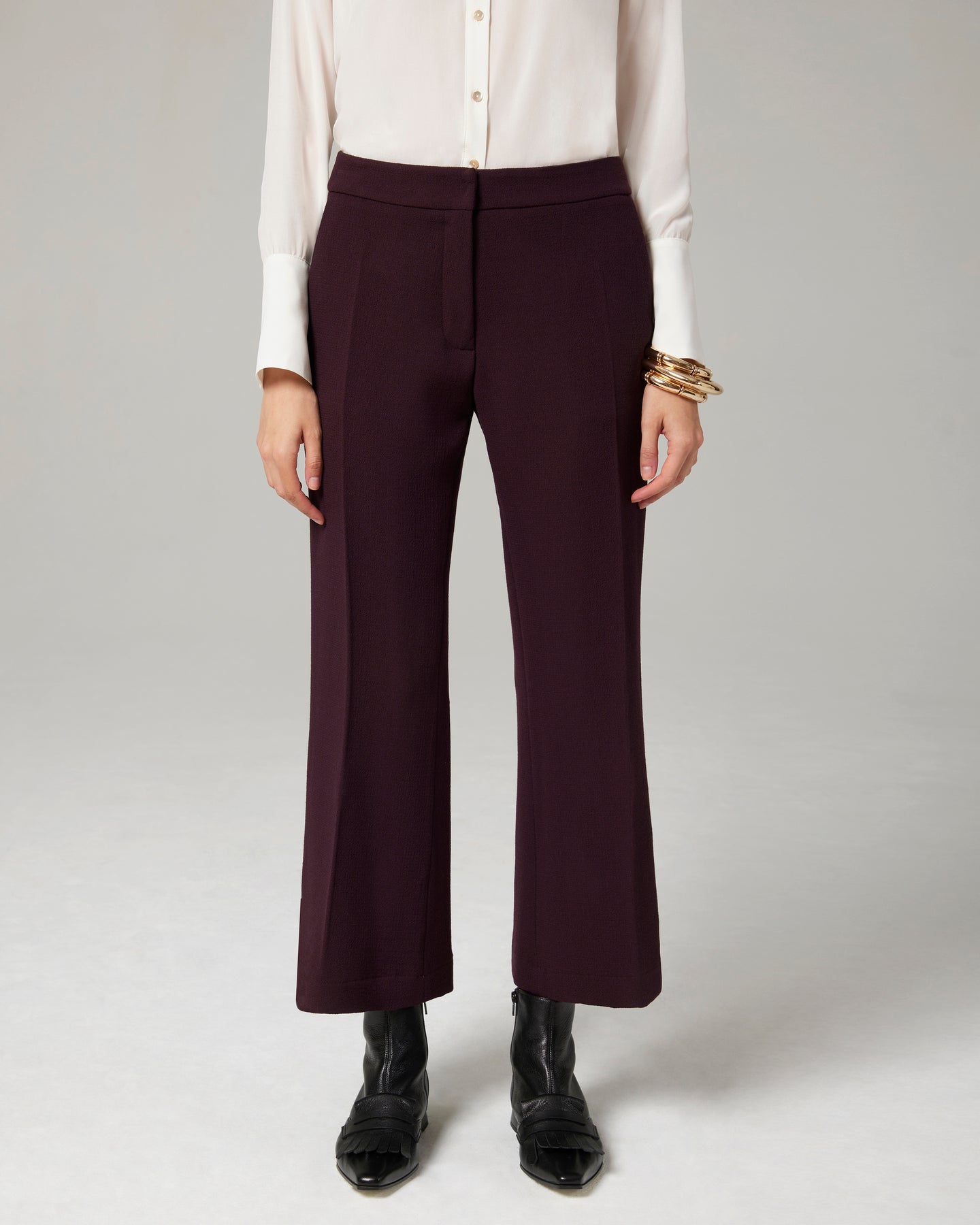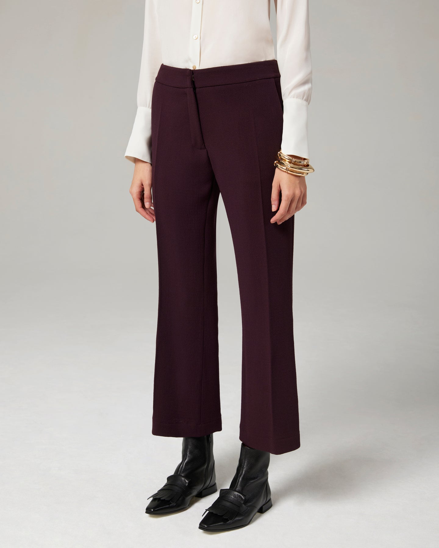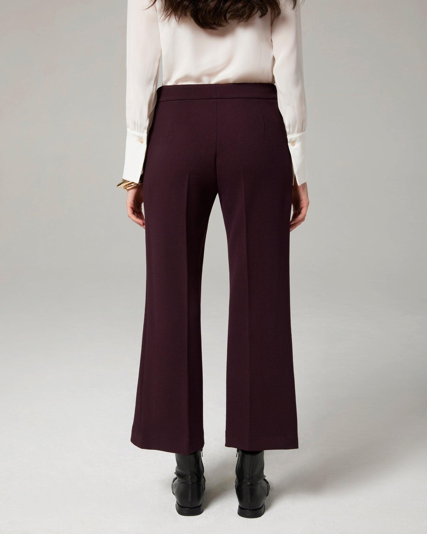 Un grande classico di 4uattro il pantalone a "trombetta" che slancia la figura. Qui in doppio crepe di pura lana, dalla lunghezza appena sopra la caviglia.