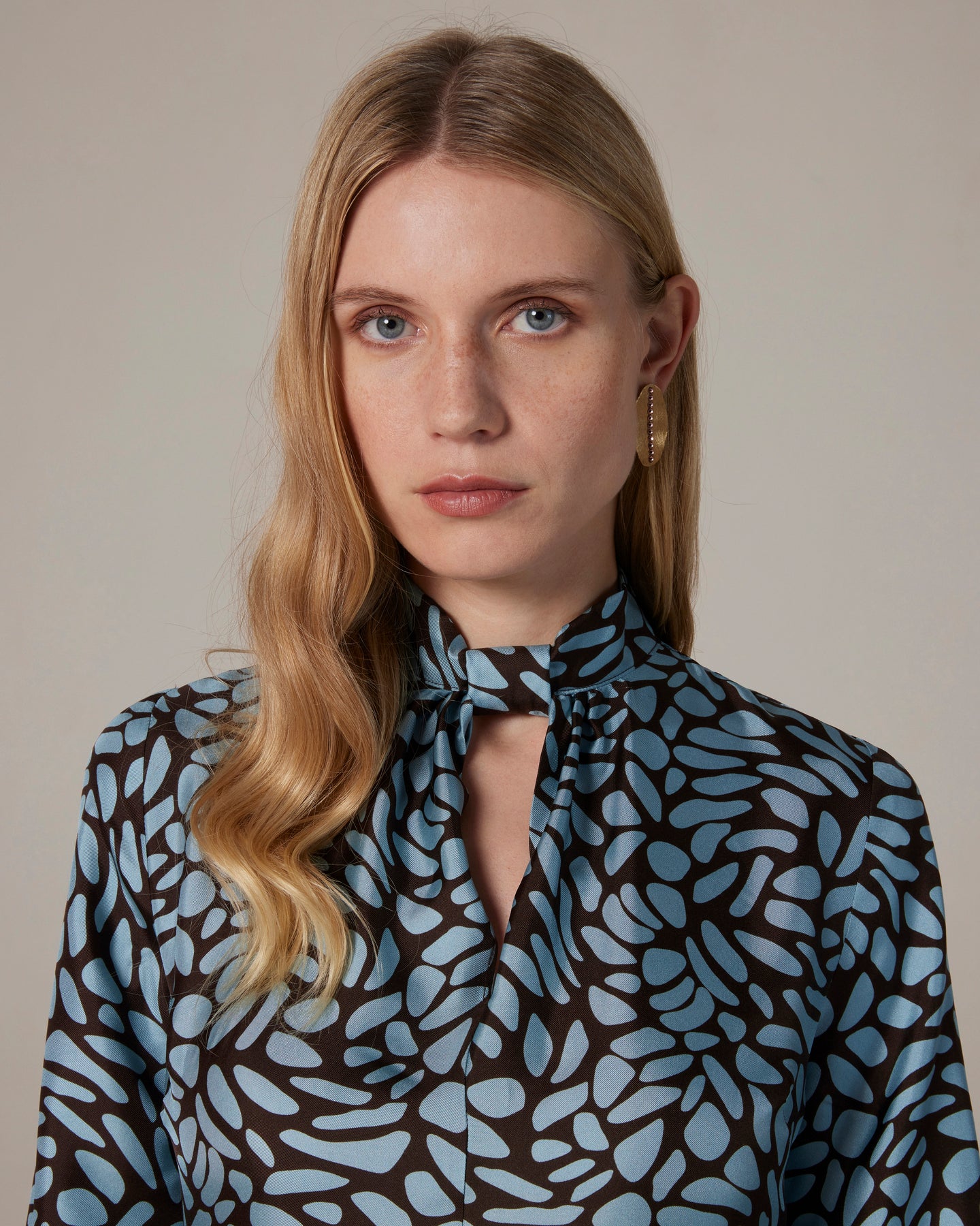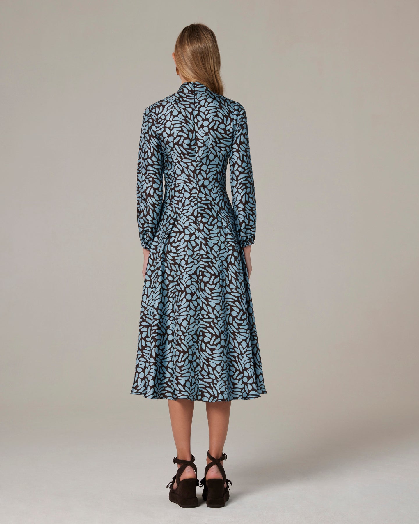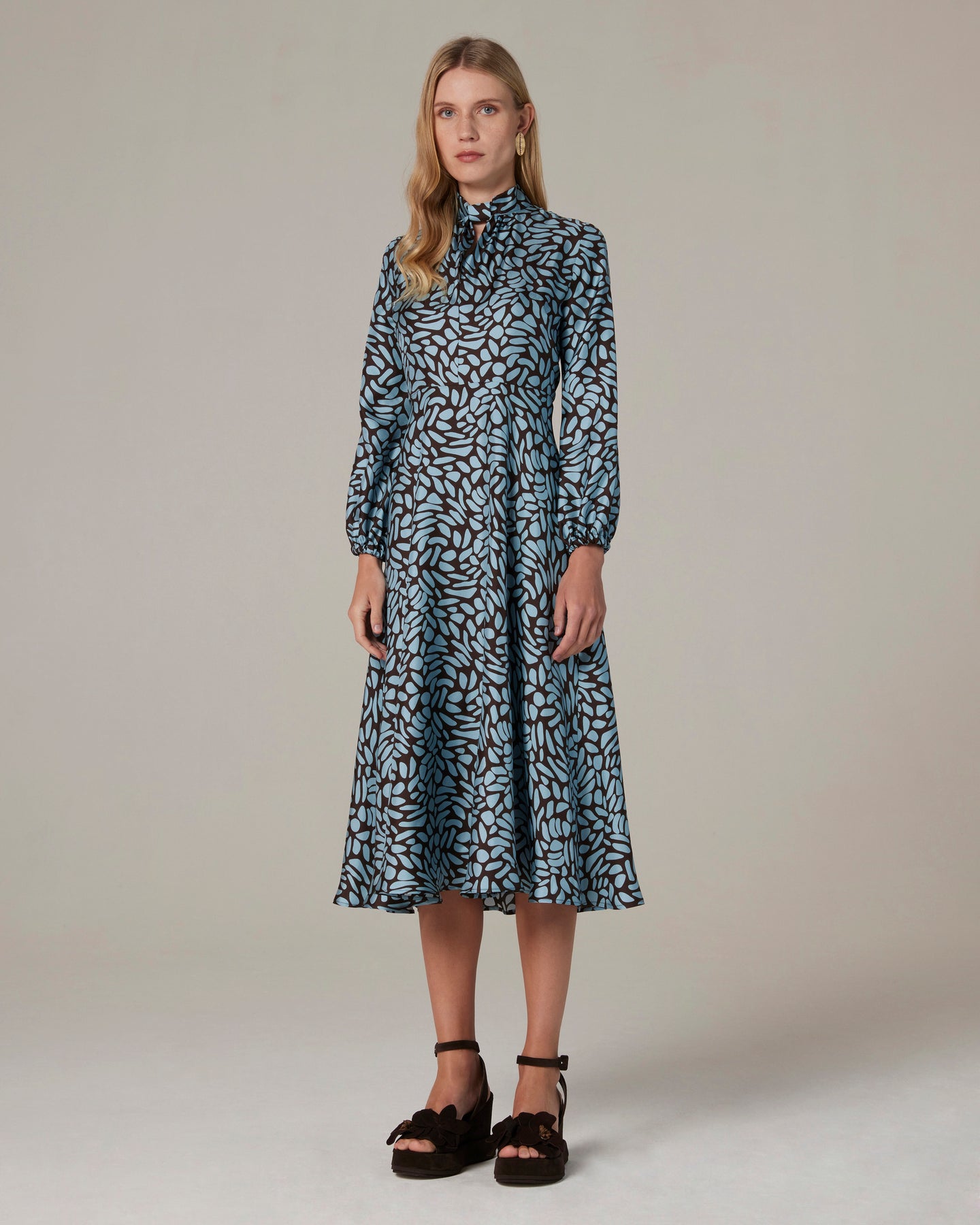 Abito midi in seta. Goccia centrale che si apre dal collo a listino che forma un nodo decorativo. Zip sul retro.