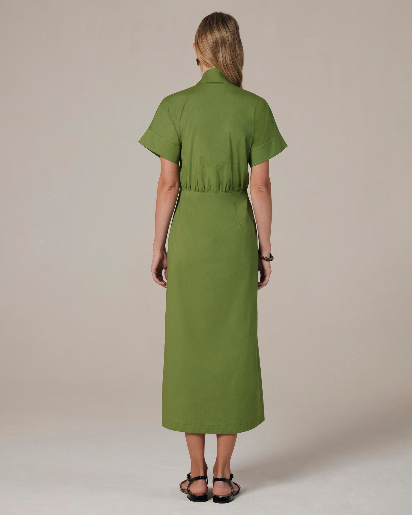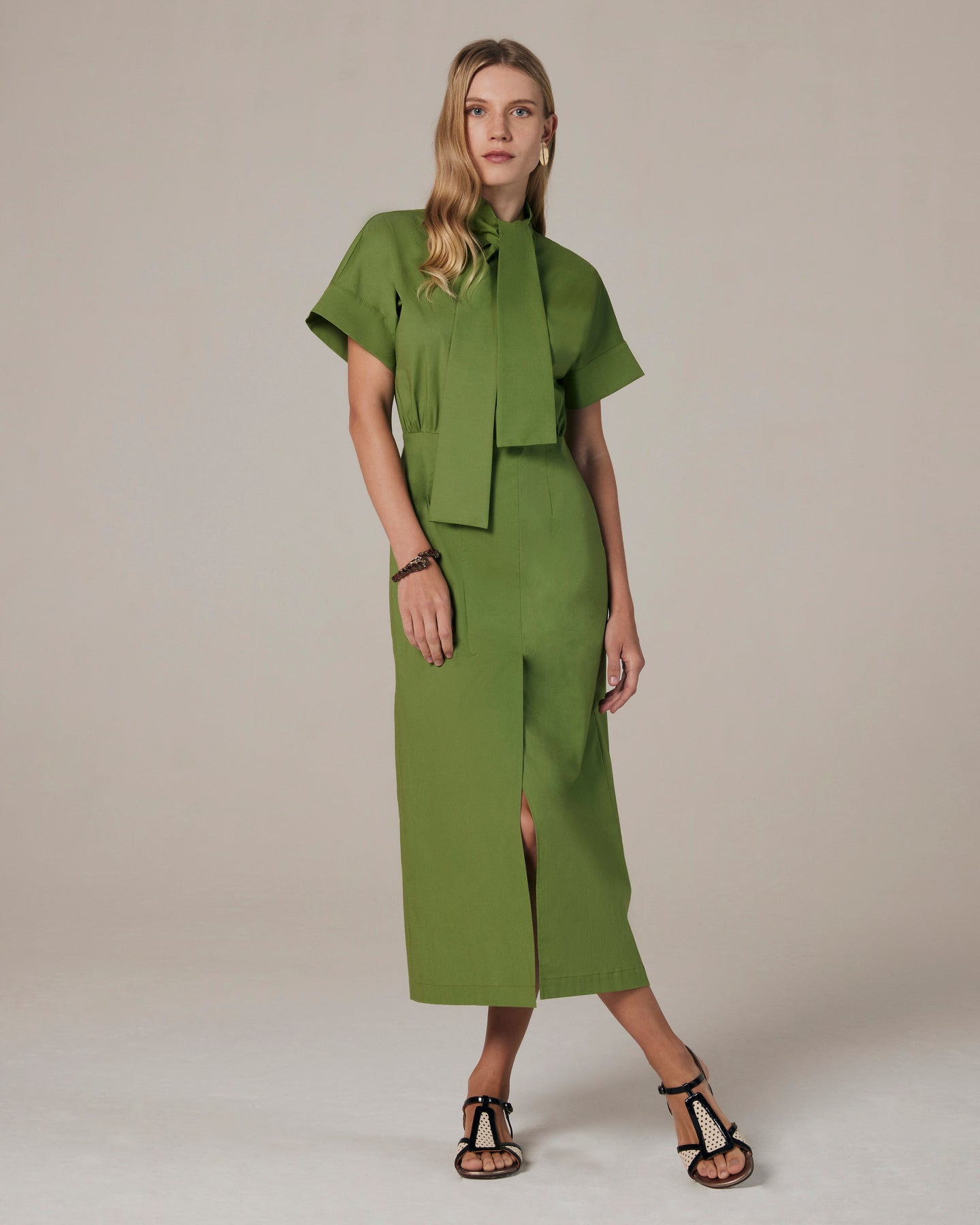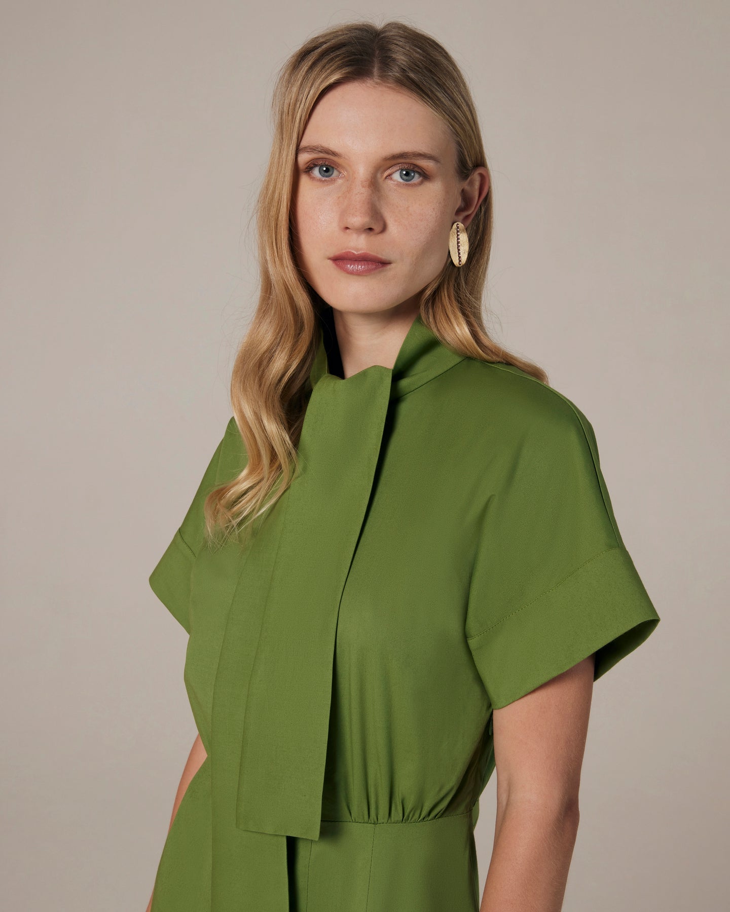 Chemisier in popeline di cotone elasticizzato. Gonna dritta midi con spacco sormontato sul davanti. Dal collo partono due bande decorative che formano un nodo laterale. Manica corta a kimono con risvolto.
