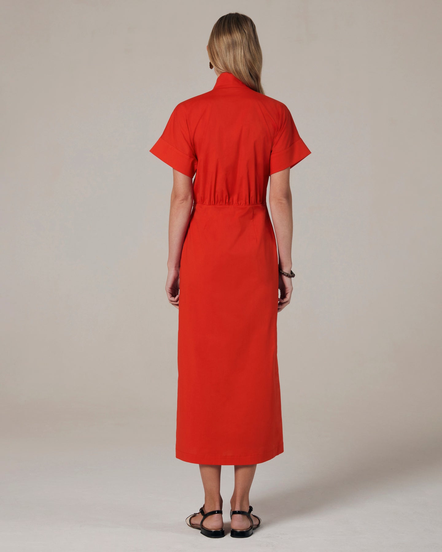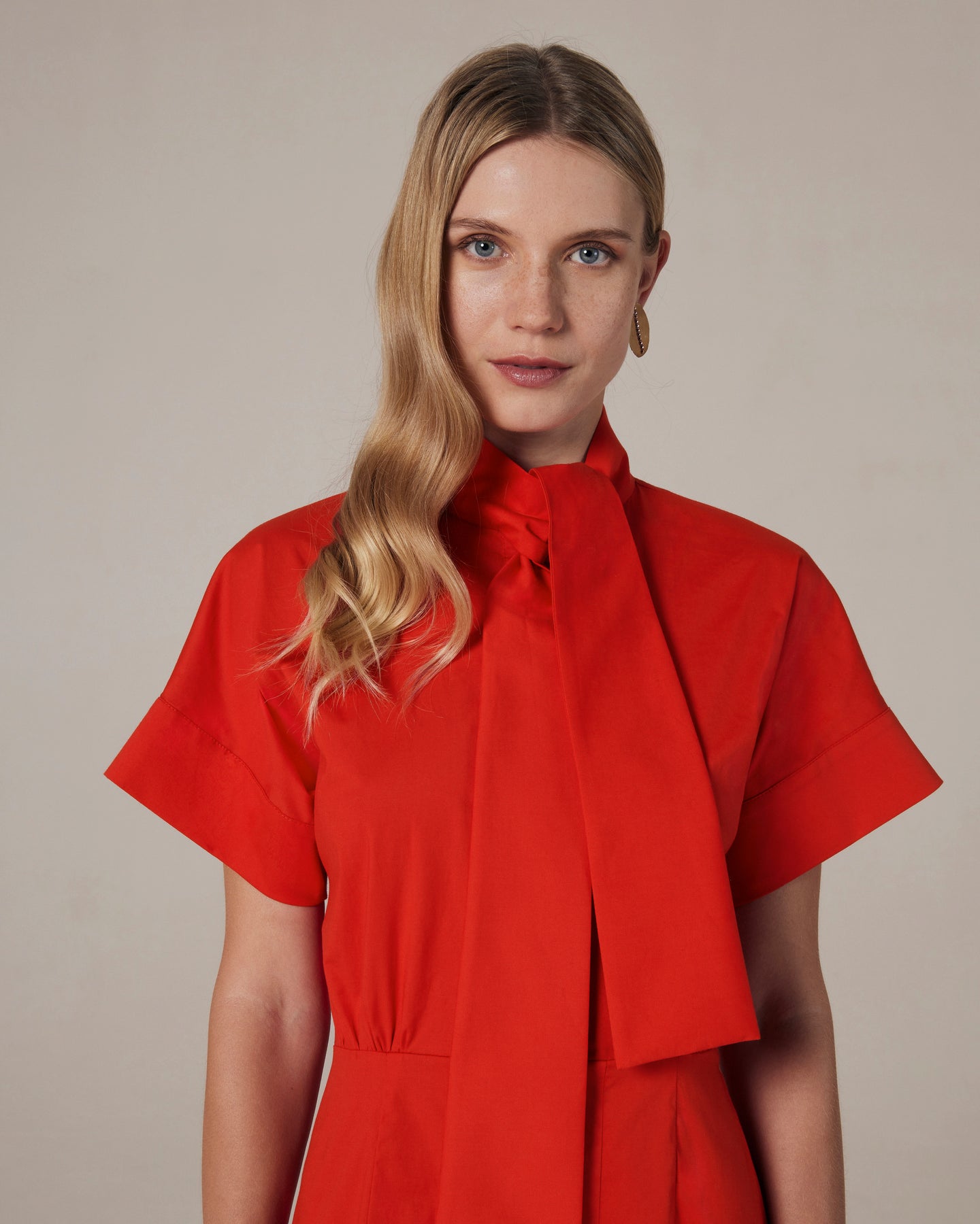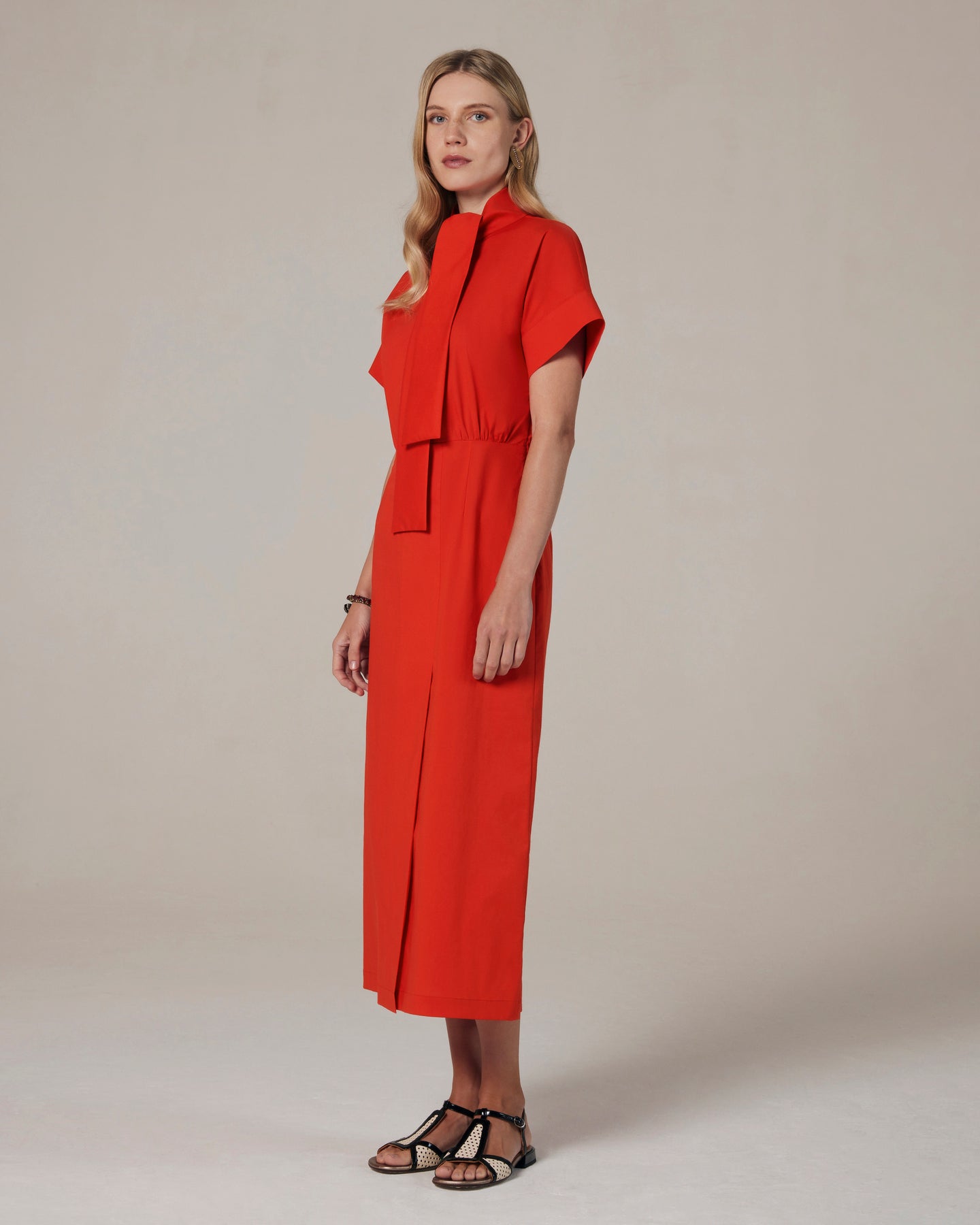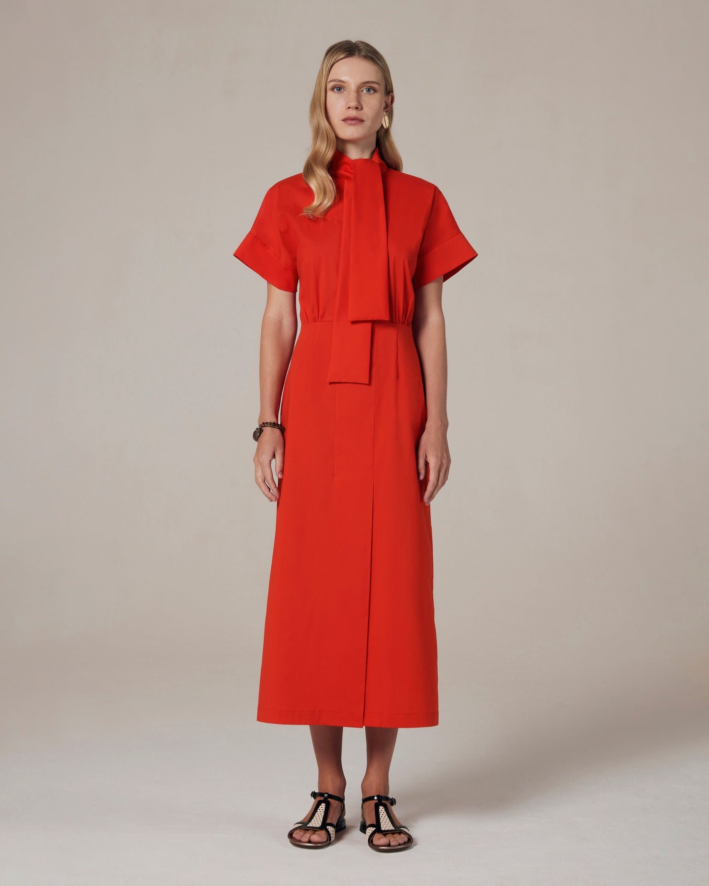 Chemisier in popeline di cotone elasticizzato. Gonna dritta midi con spacco sormontato sul davanti. Dal collo partono due bande decorative che formano un nodo laterale. Manica corta a kimono con risvolto.
