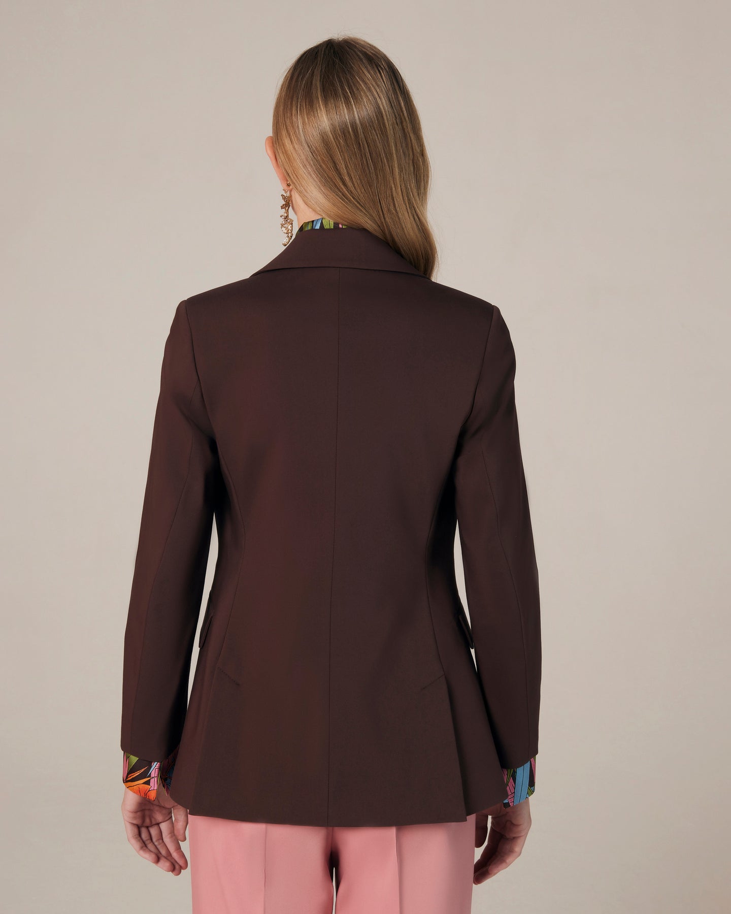 Giacca monopetto in cotone elasticizzato con ampio revere dalle proporzioni perfette. Accostata in vita, spacchi posteriori.