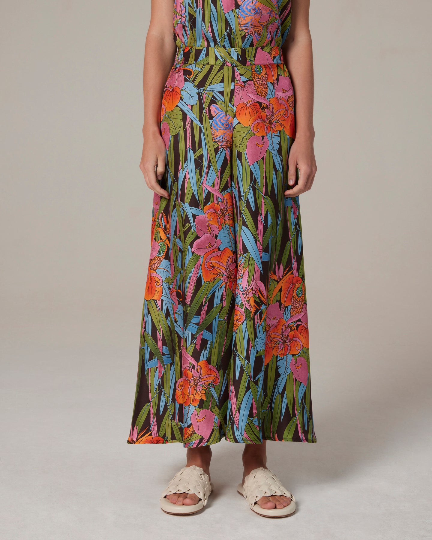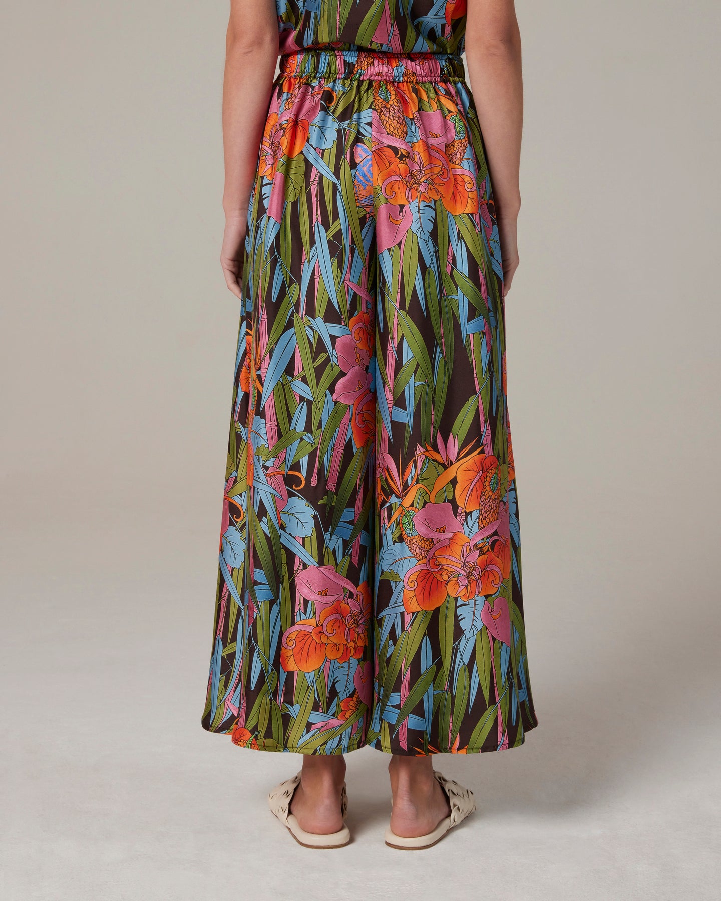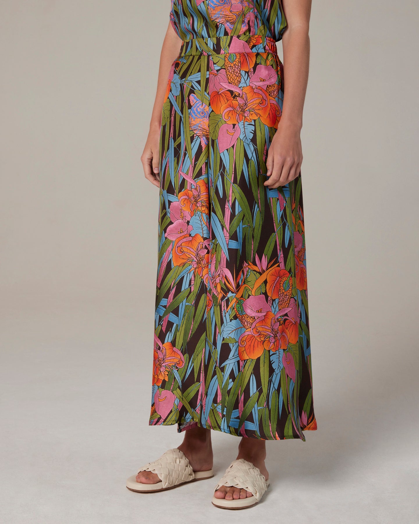 Pantagonna in un fresco e fluido twill di seta stampato in un’allegra giungla estiva. Elastico sul retro, tasche laterali. Veste bene tutte le taglie.