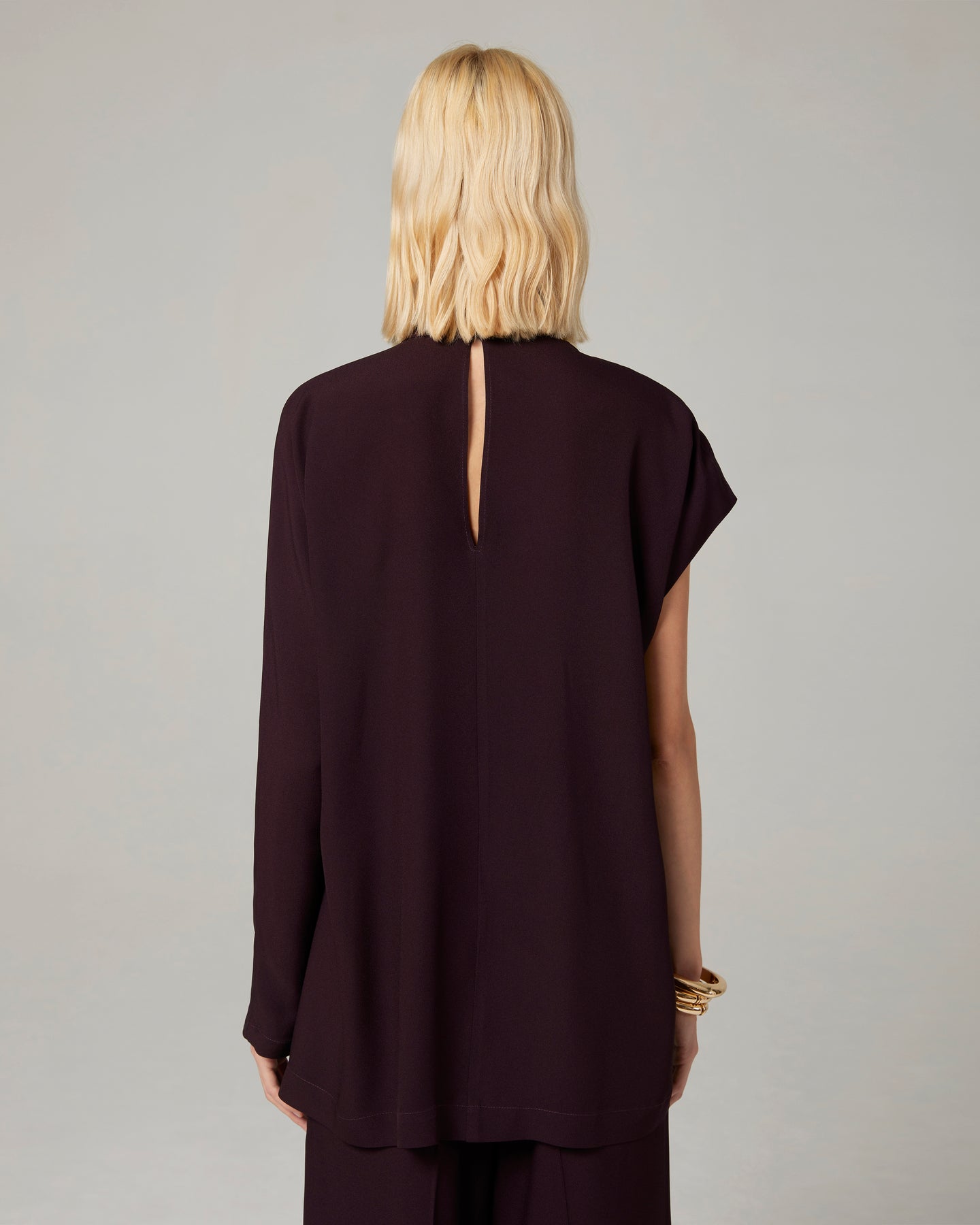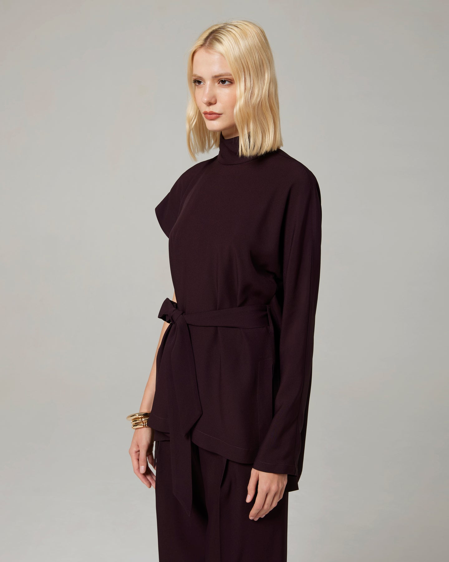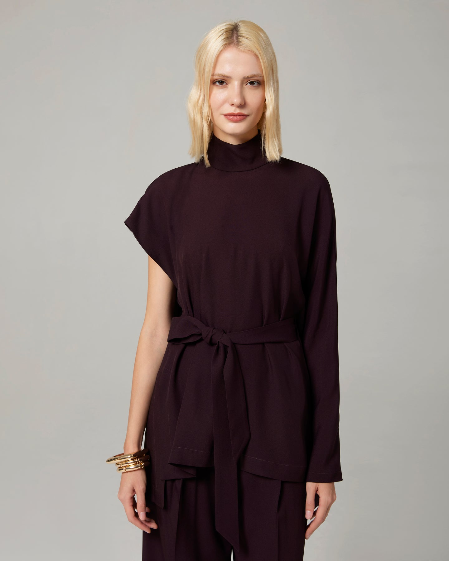 Blusa con maniche asimmetriche in morbido e cascante cady. Dalla silhouette contemporanea, si raggruppa sul davanti con una cintura. Collo alto a listino, spacchi laterali.