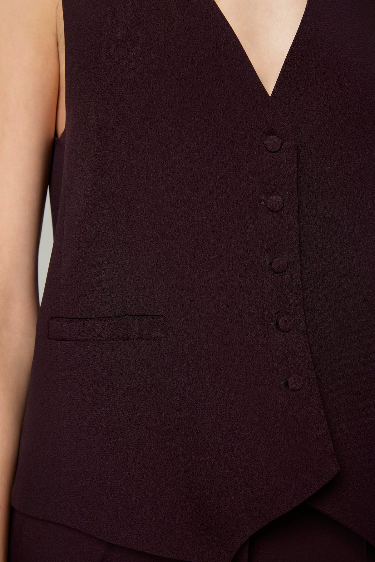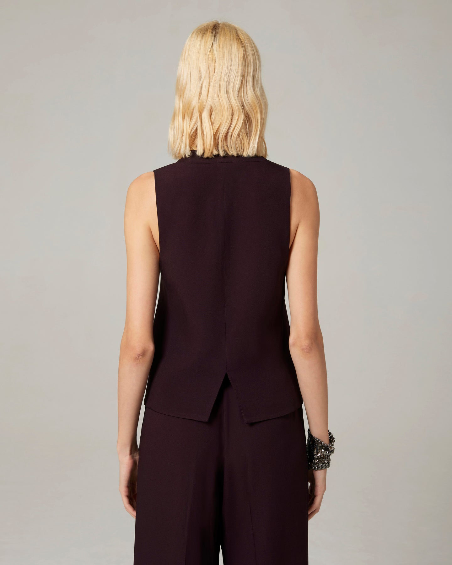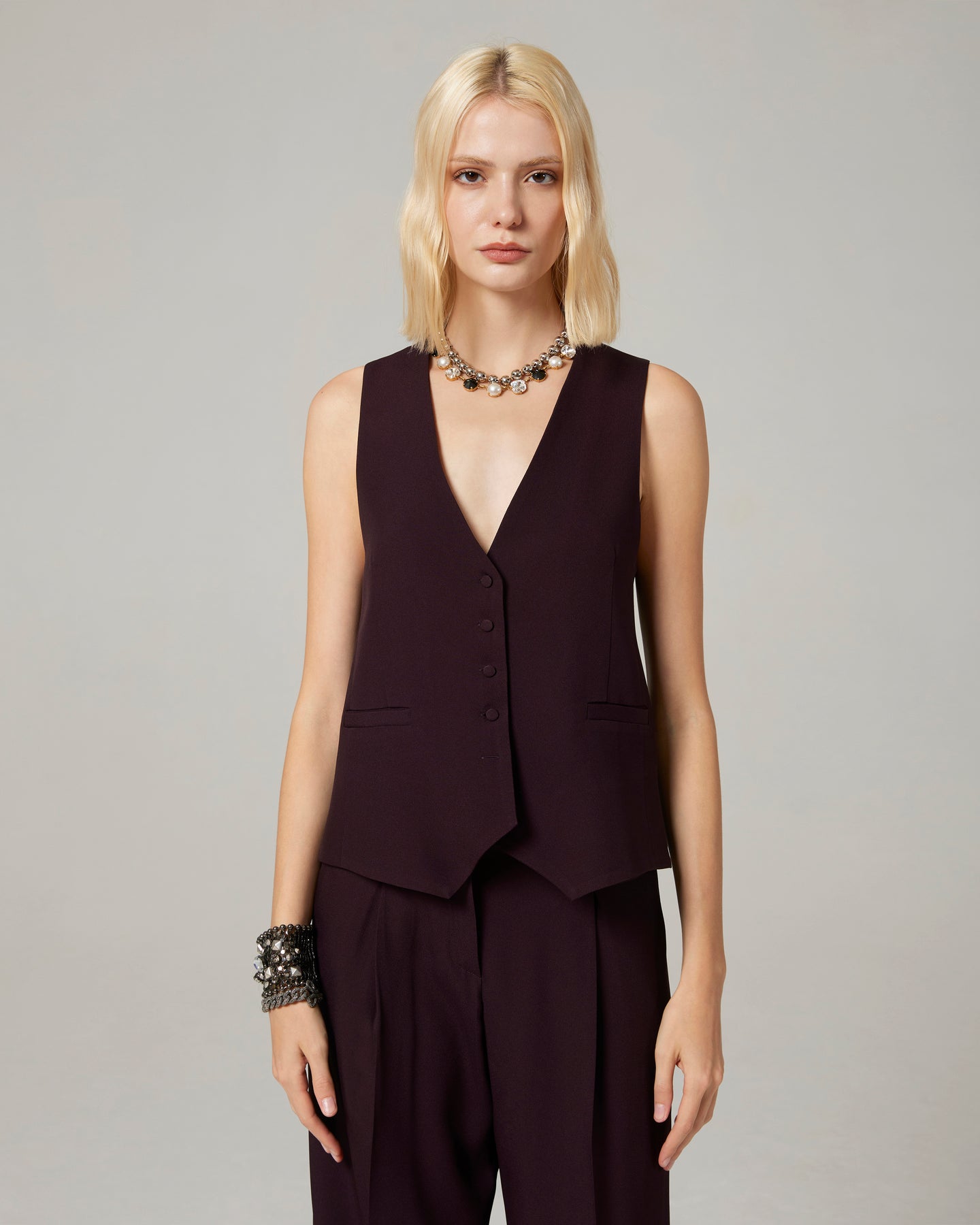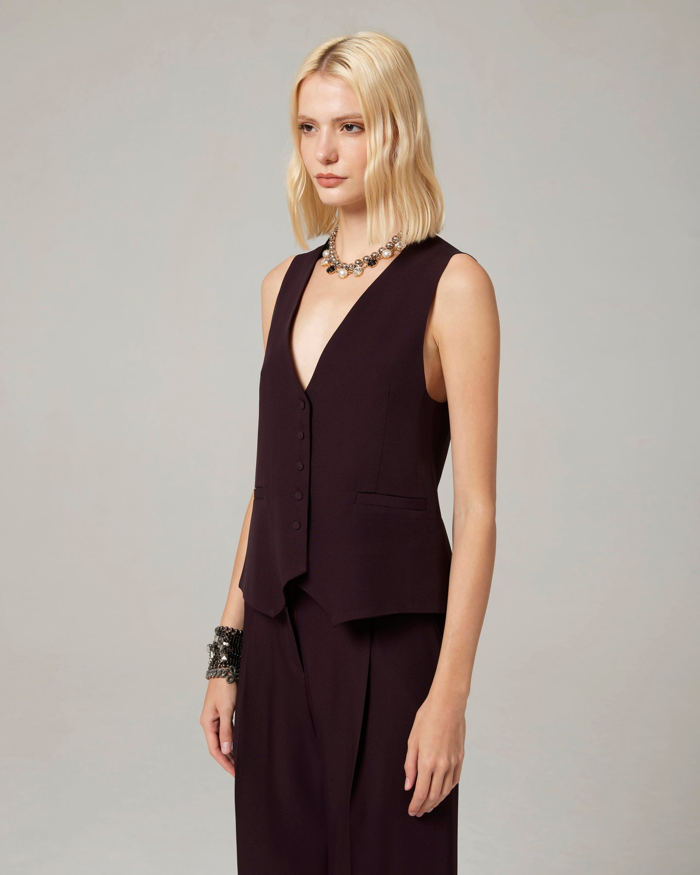 Gilet di impostazione maschile ma con dettagli superfemminili, come i piccoli bottoni ricoperti e la linea sciancrata. Si può portare a pelle o con sotto una camicia.