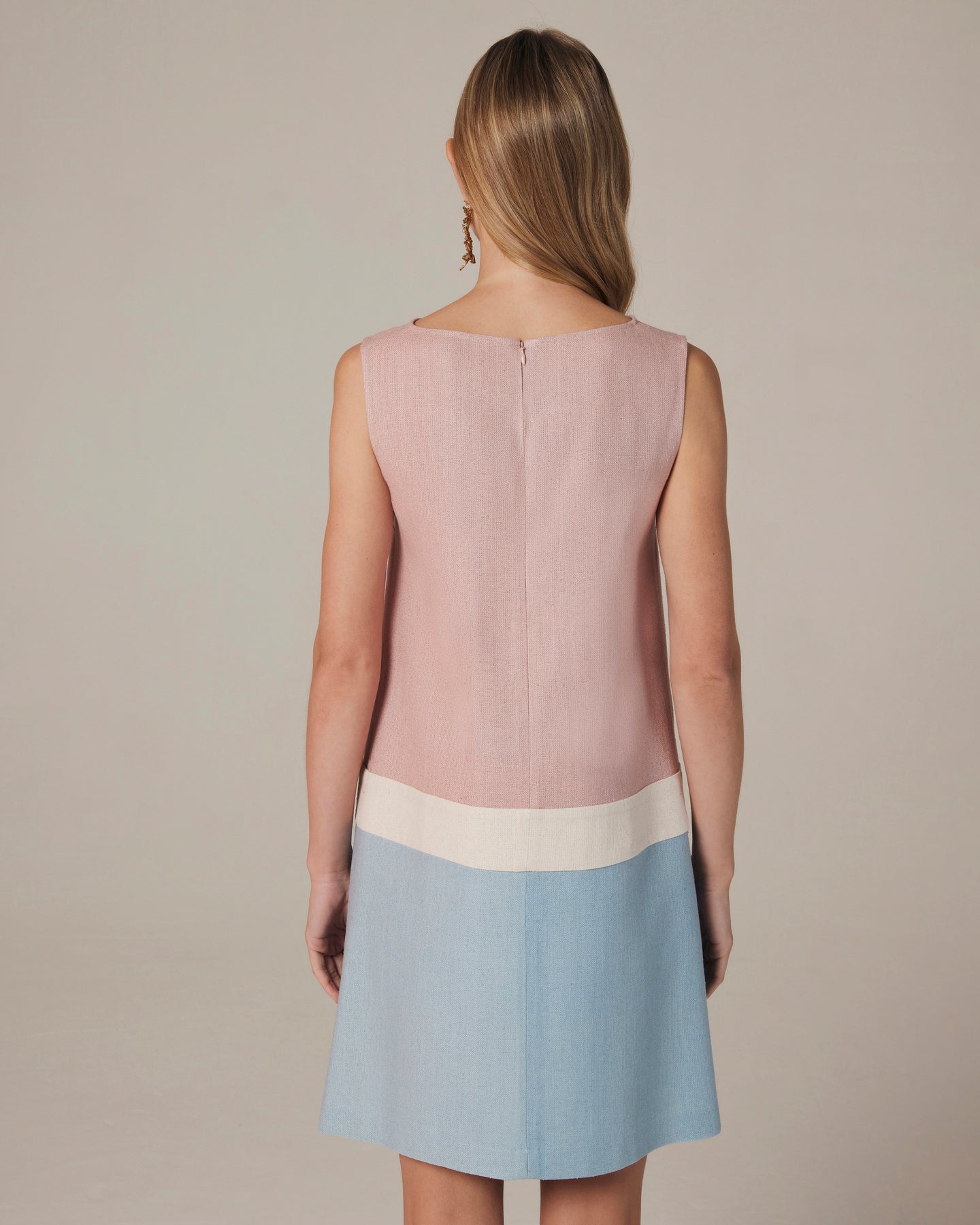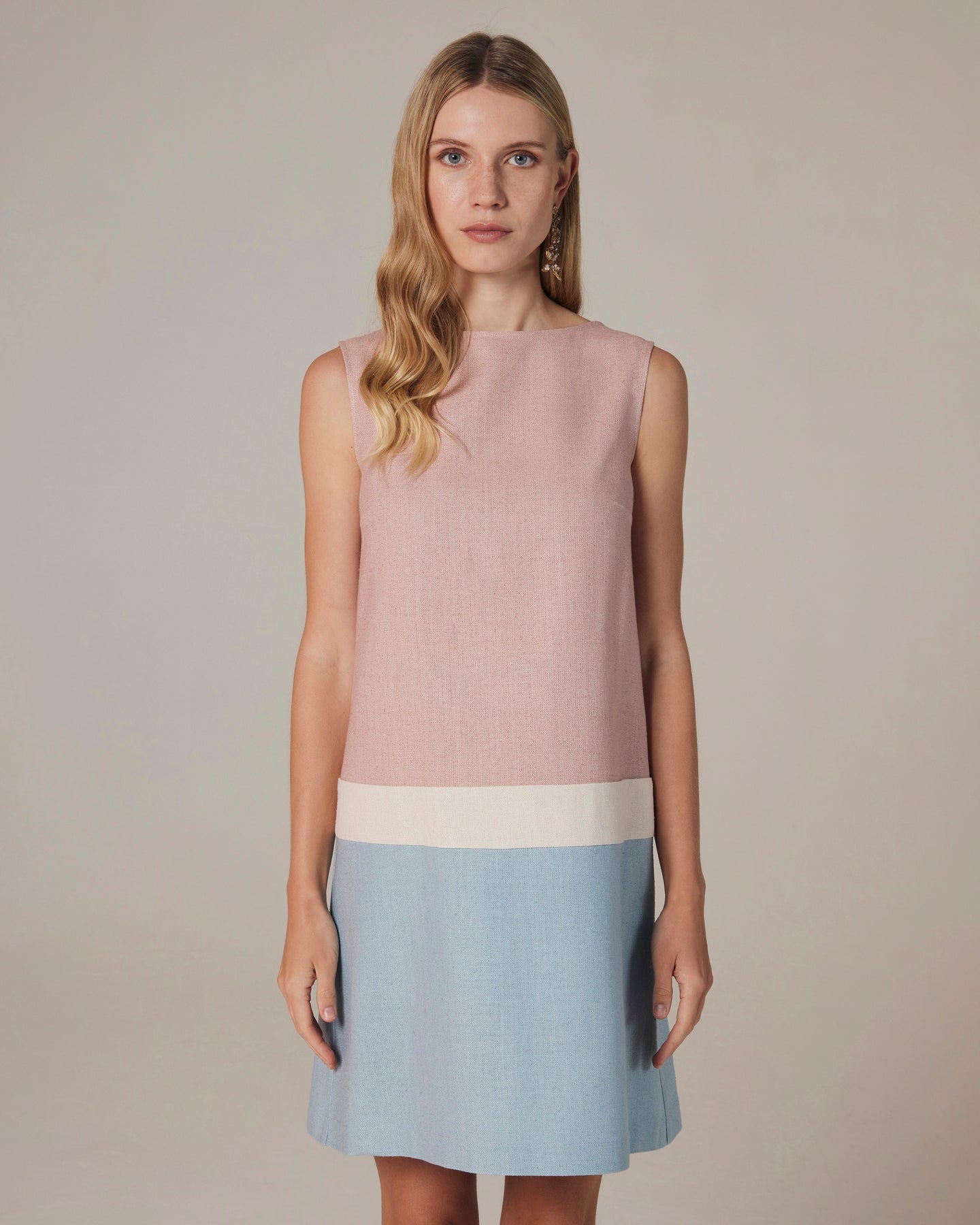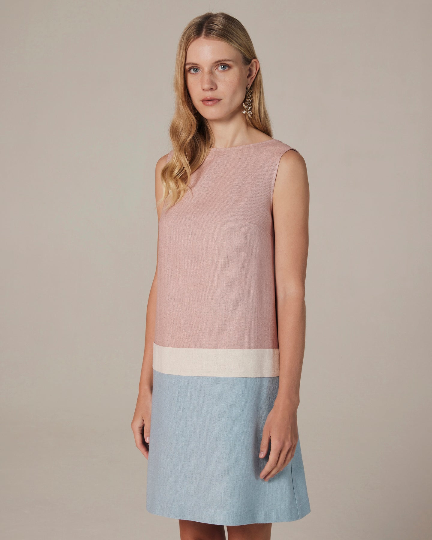 Color block dress in bourette silk with delicate shades. Bag shape, knee-length.